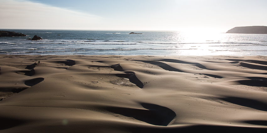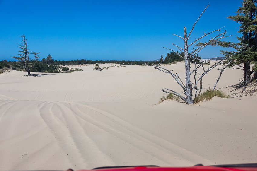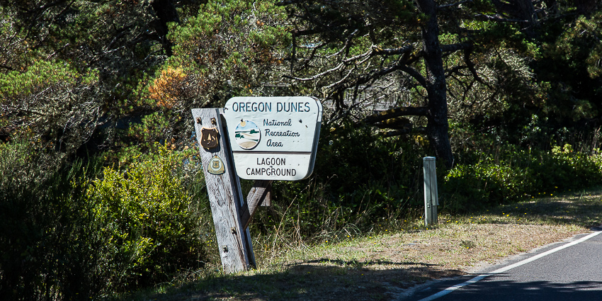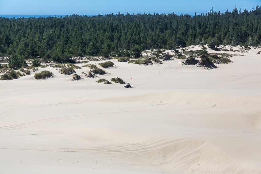 Nach einer guten halben Stunde Fahrt kamen wir in Dunes City an und tankten erstmal für über 210$ unsere Wägelchen voll. Überall waren Wohnmobile oder PickUps mit ihren Anhängern, in denen die sogenannten ATV’s verstaut waren. ATV steht für „ All Terrain Vehicle“. Wir fuhren weiter immer den Oregon Dunes entlang auf der Suche nach einem Anbieter für geführte ATV- Touren. Wir dachten uns, dass ein Profi doch mit mehr Action durch die Dünen brettert, als ein blutiger Anfänger der erst mal mit Vorsicht an die Sache rangeht. Irgendwo hinter Dunes City fuhren wir in einen der vielen kleinen Parks, die direkt in die großartige Dünenlandschaft führten. Wir parkten unser Womo und liefen die Düne bis zum obersten Punkt hinauf, auf der anderen Seite erwartete uns das Meer. Da es aber mittlerweile ja schon gegen 12.30 war und der Wind uns fast umblies, entschieden wir uns doch weiter Richtung ATV- Anbieter zu fahren.