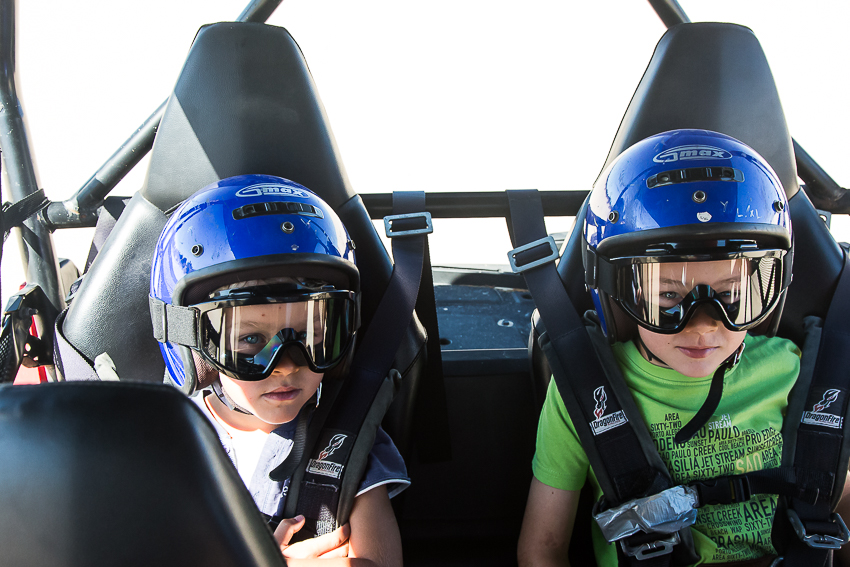 Wir bekamen ein 10 minütiges Einweisungsvideo und eine persönliche Erklärung zum Gelände anhand einer großen Landkarte. Dann ging es hinaus und wir mussten uns passende Helme aussuchen. Die Kinder bekamen noch ihre Schutzbrillen (gegen den Sand) und dann durften wir schon in unseren 4- Sitzer einsteigen. Auch hier gab es noch einmal eine kurze Einweisung und ein kurzes „Probefahren (einmal vor und zurück) und dann konnten wir auch schon los. Ein kurzer Weg durch den Wald und an einem Campingplatz vorbei führte uns dann direkt in das riesige Dünengebiet. Anfangs noch etwas vorsichtig, ging es dann etwas mutiger immer wieder die Dünen rauf und wieder runter. Nach einer halben Stunde wechselten wir und Birgit setzte sich ans Steuer. Sie hatte jedoch als Beifahrer mehr Spaß (unter anderem weil sie aufgrund ihrer Körpergröße nicht so gut ans Gaspedal kam) und so wechselten wir eine viertel Stunde später noch einmal. Die Stunde verging wie im Flug und vor allem ich hätte noch ewig so weiter fahren können.