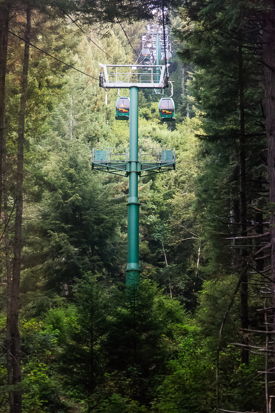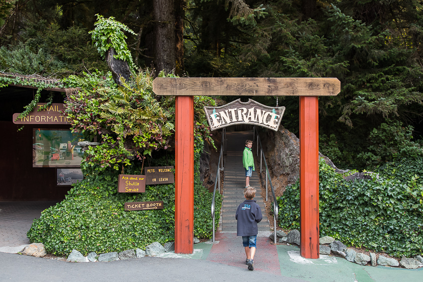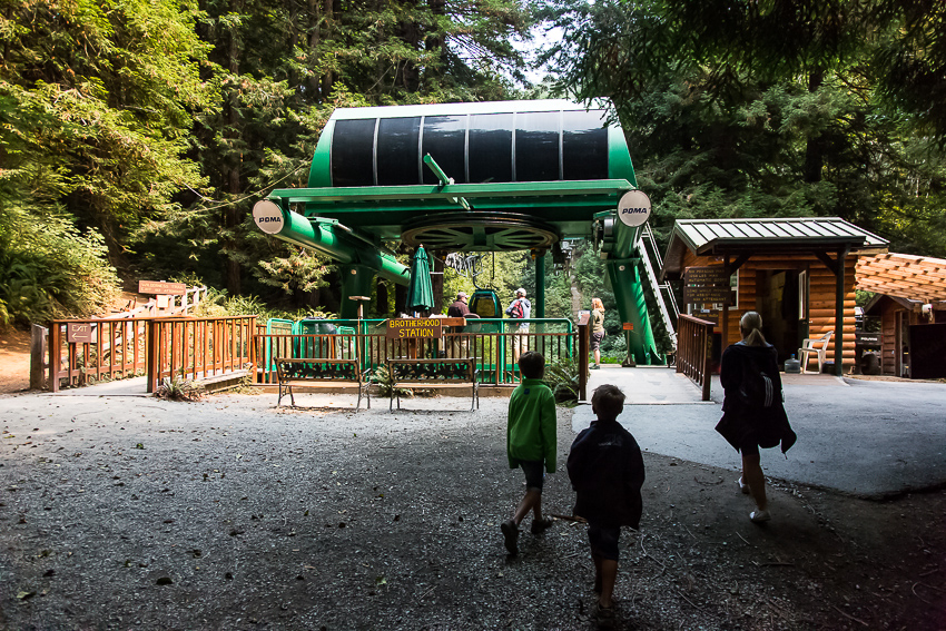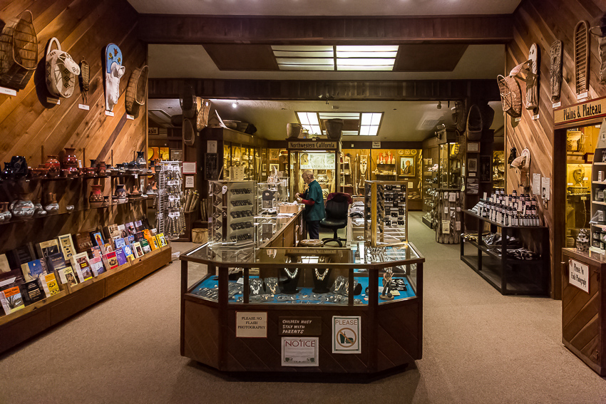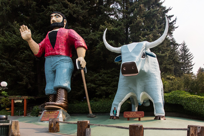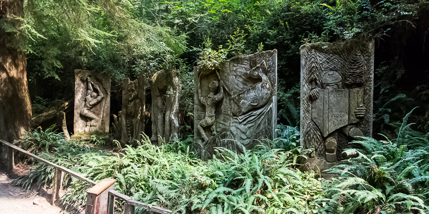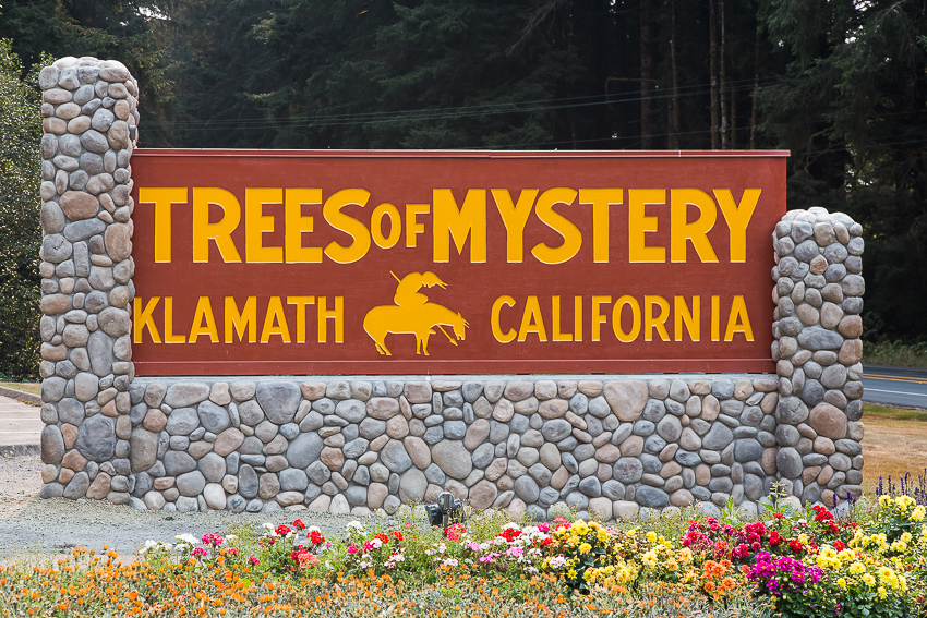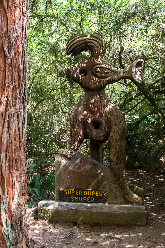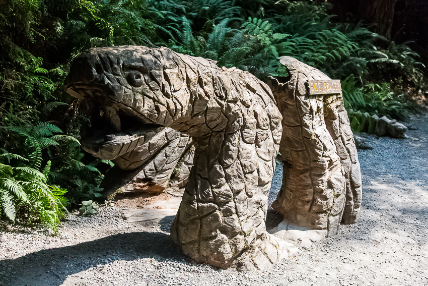 Obwohl ich schon das schlimmste befürchtete (der Reiseführer sprach von Kommerz), besuchten wir den „Tree’s of Mystery“ Park. Hier soll es einige ungewöhnliche Baumvarianten der Küstenredwoods geben sowie Schnitzereien des ehemaligen Holzfällers Paul Bunyan. Keine Ahnung, er hat mich weder vorher noch nachher großartig interessiert. Trotzdem zahlten wir die knapp 40$ Eintritt und „bestaunten“ dann auf einem Rundweg einige schöne Mammutbäume und Holzschnitzereien. Außerdem konnte man mit einer Gondel bis zu einer Aussichtsplattform fahren. Wir beließen es aber bei einer kompletten Runde, der Fußweg nach unten hätte mit angegebenen 1,6 Meilen zu viel Zeit in Anspruch genommen. Danach liefen wir Richtung Ausgang und besuchten den wirklich gut gemachten Giftshop mit angeschlossenen Indianermuseum (sehr gut).  Alles in allem würden wir den Park aber nicht mehr besuchen, im Nationalpark gibt es größere und genauso interessante Redwoods. Und die Holzschnitzereien von Paul, nun ja, mein Fall waren die Dinger nicht. Alles in allem „kostete“ uns der Park rund 1,5 Stunden.