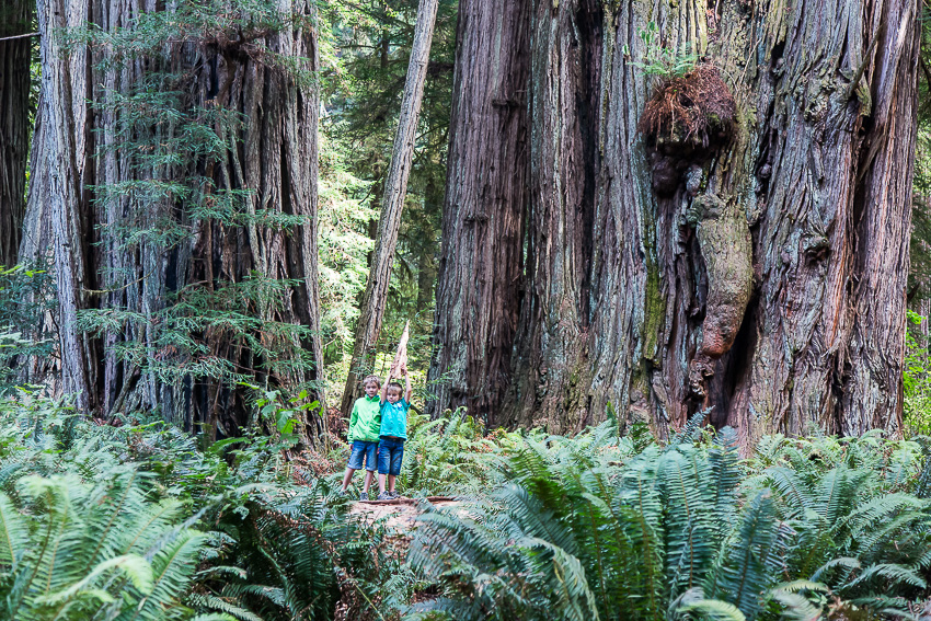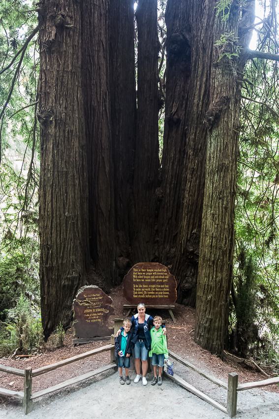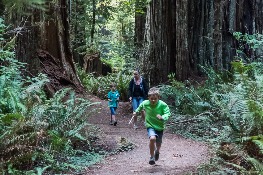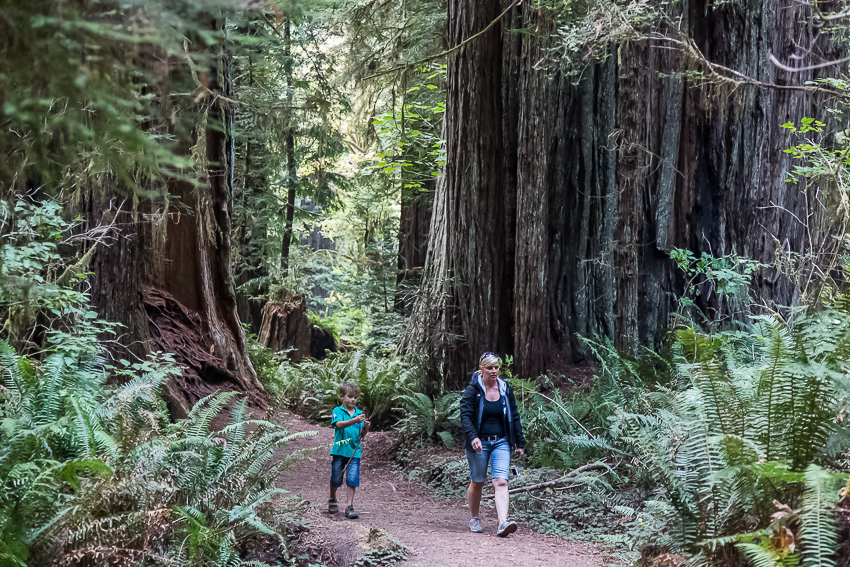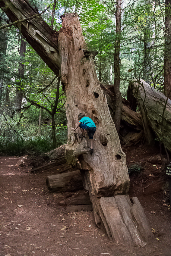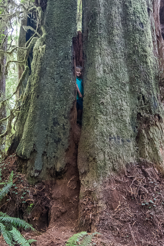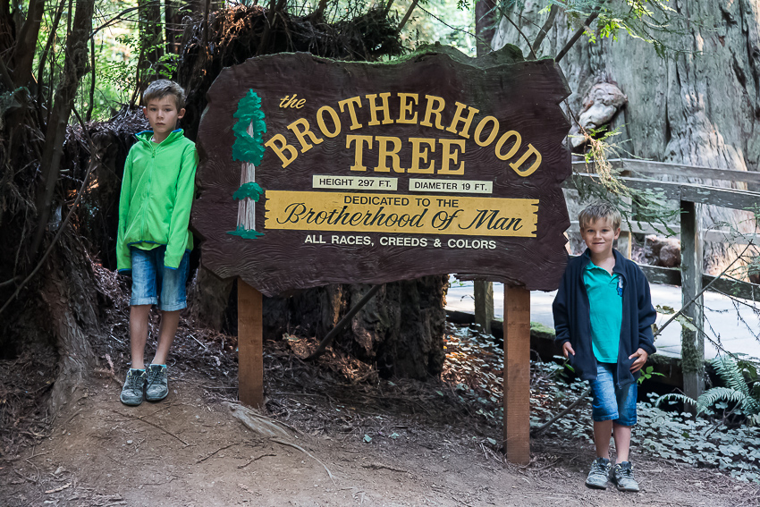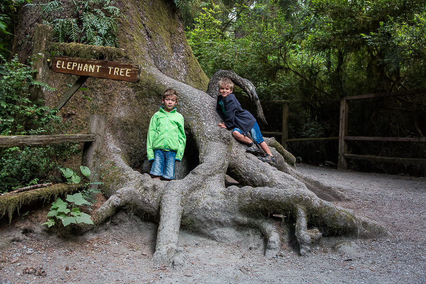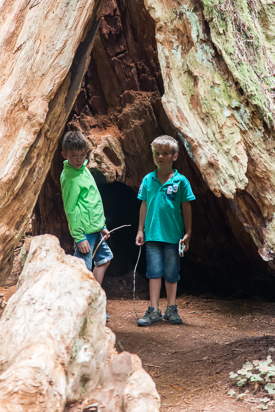 Wir parkten das WoMo am Straßenrand und schlugen uns quer durch die Büsche. Und woow, der Weg war wesentlich interessanter als der im „Tree’s of Mystery“. Die Bäume waren größer und interessanter und Tom und Paul kletterten wie die Wilden in den zum Teil zerklüfteten Baumstämmen umher. Dafür das Tom erst gar nicht aus dem RV aussteigen wollte, hatte er jetzt tierischen Spaß. Mindestens eine Stunde verbrachten wir auf den Wegen rund um den „Big Tree“, dann machten wir uns gegen 16.00 auf weiter Richtung Süden.