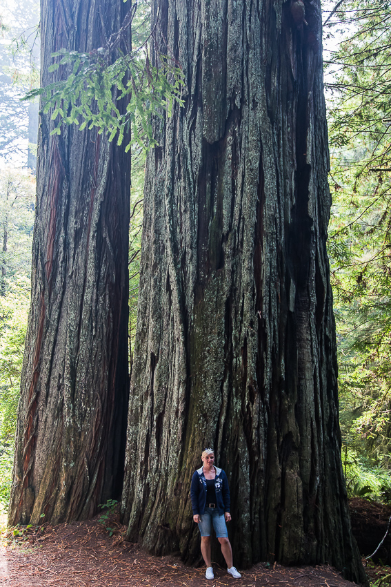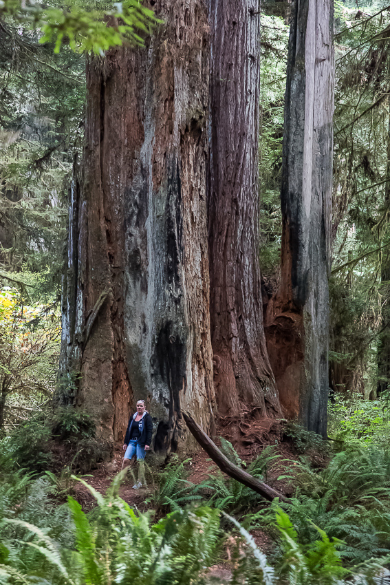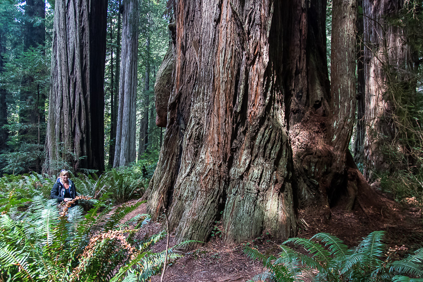 Aber ehe wir uns versahen, landeten wir wenig später im "Thomas H Kuchel Visitor Center". Ja Donnerwetter, wo ist denn nun der Eingang ???  Wir gingen rein und ich fragte die nette Rangerin, wo es denn mit einem über 30’ großen RV die schönsten Mammutbäume zu besichtigen gibt. Sie markierte uns im Plan zwei Stellen, eine davon war der „Big Tree“ im "Prairie Creek Redwood State Parks". Ja, da waren wir vorhin doch schon vorbeigefahren. Na ja, es waren letztendlich ca. 15-20 Minuten Weg Retour, dann waren wir wieder am Parkplatz des „Big Tree“ angekommen.