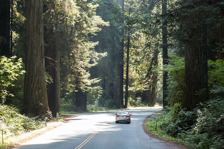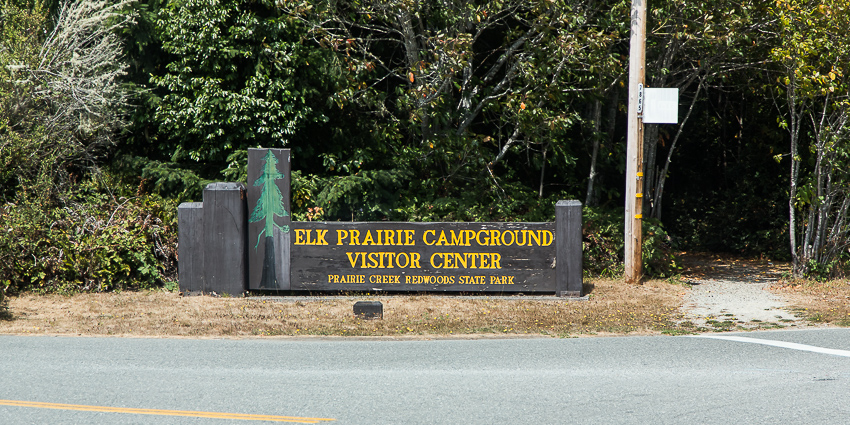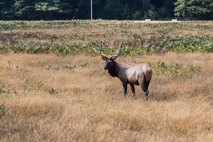 Weiter ging es nun aber zu den großen Redwoodbäumen innerhalb des NP’s. Wir fuhren den "Newton B. Drury Parkway" entlang und bewunderten die zum Teil riesigen Mammutbäume entlang der Straße. Allerdings hielten wir nicht an, weil wir immer auf den Main Entrance mit Kassenhäuschen warteten. Das kam aber nicht und so landeten wir dann am "Elk Prairie Visitor Center" des "Prairie Creek Redwood State Parks". Da leider weit und breit kein Ranger in Sicht war, versorgten wir uns mit einer Übersichtskarte des National, - und vorgelagerten Stateparks. Dann wurde noch schnell ein brünftiger Elchbulle abgelichtet bevor wir weiter Richtung NP fuhren.