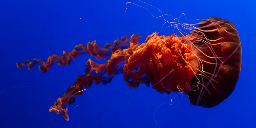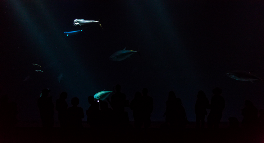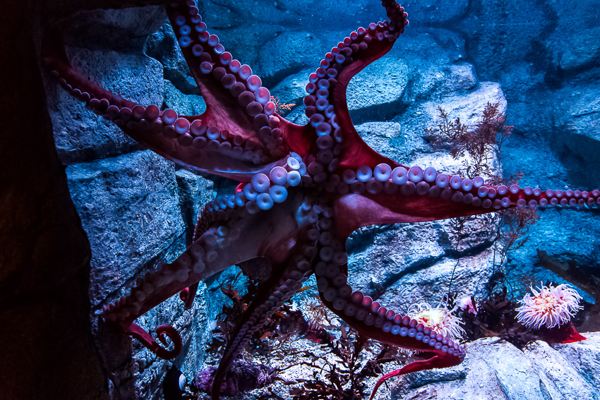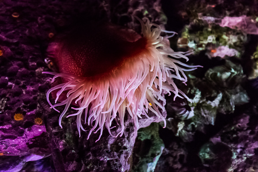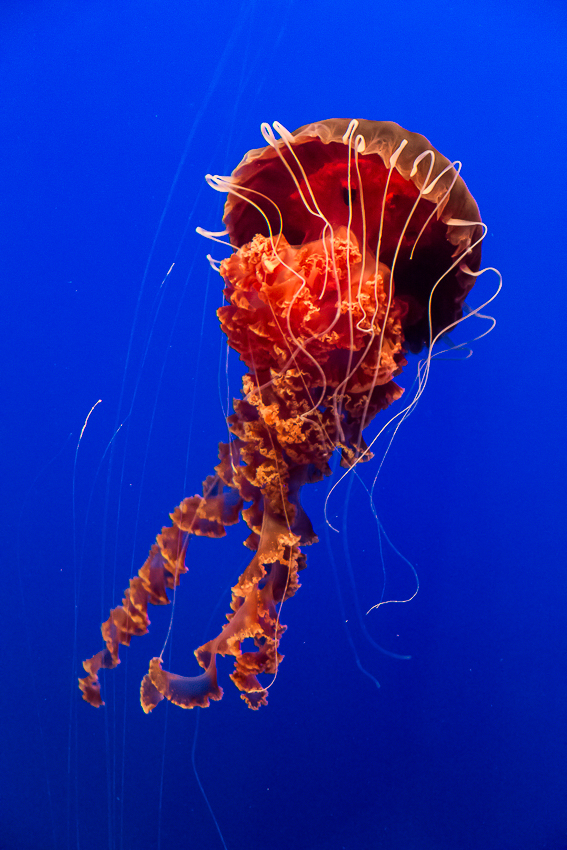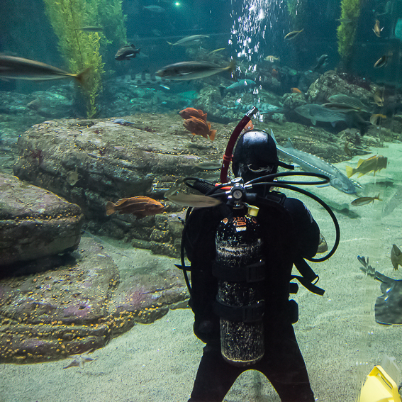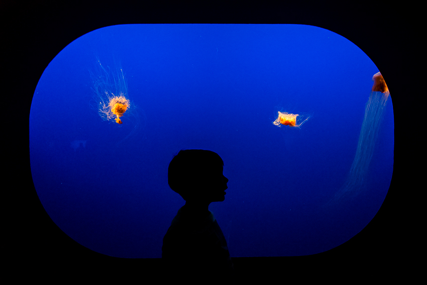 Pünktlich um 11.30 gab es dann als erstes Highlight die Fütterung der Fische im „Kelp Forest“. Eine Taucherin stieg mit einem Korb voller Fischfutter hinab in die Tiefen und ruck zuck wurde sie von einer Armada von Fischen belagert. Die Taucherin unterhielt sich per Funk mit einer ehrenamtlichen Mitarbeiterin des Aquariums und es gab immer wieder interessante Information über das Leben im „Kelp Forest“. Nach 20 Minuten ging es weiter durch die einzelnen Stationen - von „The Ocean’s Edge" über „Open Sea“, „Rocky Shore“ bis hin zu „The Jellies Experience“. Diese Abteilung ist für mich, neben dem neu eröffneten „Tentacles“ der faszinierendste Teil des Aquariums.