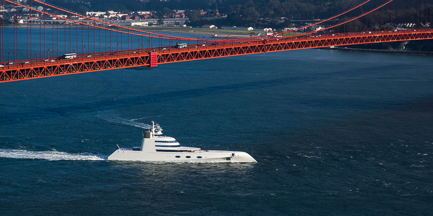 Um sich die Größe der Megayacht besser vorstellen zu können: im vorderen Bugbereich sind 2 Menschen zu sehen, von denen einer gerade die "Golden Gate Bridge" fotografiert  :guckstdu:.