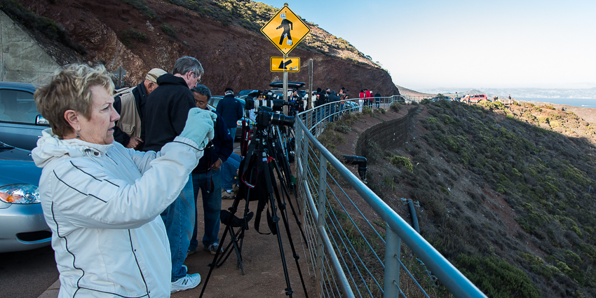 Tom und Paul wollten ja noch die Golden Gate Brücke im Dunkeln sehen. Uns so fuhren wir zeitig zum Sonnenuntergang Richtung Marin Headlands. Von dort hat man einen schönen Blick auf das Wahrzeichen der Stadt. Wir fuhren einen Aussichtspunkt nach dem anderen an, bis wir dann irgendwann relativ weit oberhalb der Brücke stehen blieben. Dort hatte sich schon eine Armada an Fotografen mit ihren Stativen und zum Teil großen Teleobjektiven versammelt. Das MUSS ja dann der richtige Platz sein. Das letzte Mal waren wir im Jahr 2007 hier. Ich wunderte mich nur etwas über die vielen Tele’s, fand etwas später aber den Grund dafür heraus: Heute war Vollmond. Na ja, pünktlich zum Sonnenuntergang zogen dann Wolken auf und verdeckten den Mond die meiste Zeit. Zuvor hatten wir aber noch beobachten können, wie eine der größten und teuersten Megayachten der Welt unter der Golden Gate durchfuhr: die Yacht „A“, Länge laut Wiki 119 Meter, Kosten des Kahns: 200 Millionen Euro. Besitzer ist der Russe „Andrei Igorewitsch Melnitschenko“.