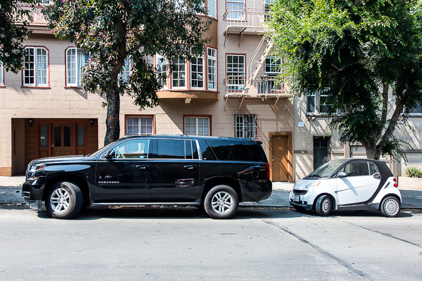 Die Schlange bei Alamo hielt sich in Grenzen und so kamen wir relativ zügig dran. Ich hatte einen Full Size SUV gemietet - genau das richtige für San Francisco :lachen07:. Als wir dann das Auto abholen wollten, ging die Mitarbeiterin eine Zeit lang die Liste der bereitstehenden Autos durch. Und da in unserer Größe kein Auto verfügbar war - bekamen wir ein Upgrate. Wir bekamen einen schnuckeligen Chevrolet Suburban - ein Riesen Schiff mit allem möglichen Schnickschnack. Auf dem Weg zum Hotel wunderte ich mich immer wieder, warum in unregelmäßigen Abständen immer wieder eine Hälfte meines Sitzes vibrierte. Am Abend auf der Heimfahrt von der Golden Gate Brücke wurde es mir dann klar: jedes mal wenn ich die Spur zur Nebenfahrbahn streifte, zeigte mir das Vibrieren an, dass ich gerade unaufmerksam war. Beim normalen Spurwechsel vibrierte nichts.