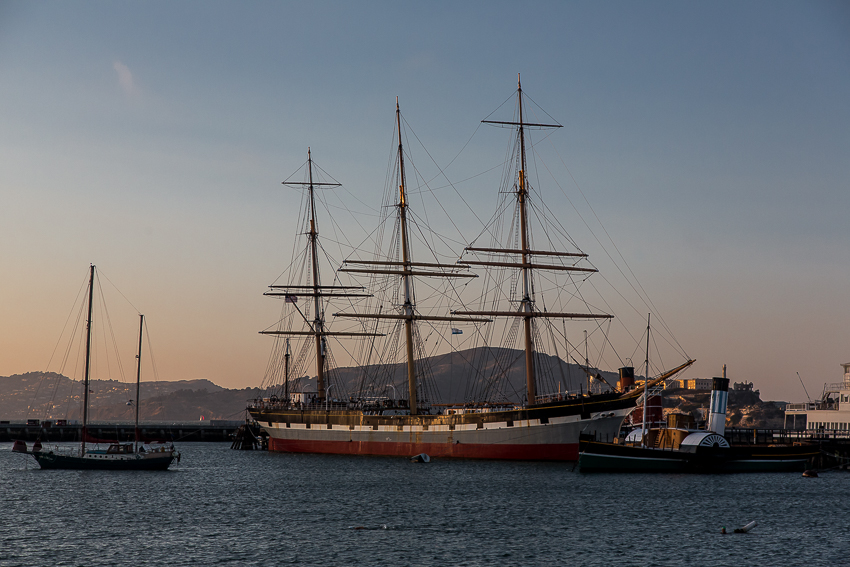 Wieder auf dem Festland angekommen, liefen wir gemächlich zurück zum Hotel. Der kleine Hunger meldete sich schon wieder. Während Birgit mit den Kindern schon ins Zimmer ging, lief ich noch ein paar Meter weiter zum „San Francisco Maritime National Historical Park“. Ich schoss ein paar Bilder von der dort liegenden „Balclutha“, einem alten 3 Master aus dem Jahre 1886, dann ging auch ich zurück ins Hotel. Dort grübelten Birgit und ich kurze Zeit, wo es denn heute zur allabendlichen Fütterung der Raubtiere hingehen sollte. Da aber alle etwas platt waren, beließen wir es mit einer weiteren Autofahrt und gingen nur in das in 5 Laufminuten entfernte Denny’s - in diesem Jahr unser erster Besuch in diesem Dinner. Der Laden hatte 24 Stunden rund um die Uhr geöffnet, wir kamen um kurz vor 20.00 dort an. Paul aß Spagetti, Birgit eine halbe Portion Nachos (normalerweise ein Appetizer, aber eigentlich kann man danach gar keinen Hunger mehr haben) und ich einen Double Cheeseburger. Tom wollte nichts, er hatte urplötzlich aus heiterem Himmel Bauchschmerzen bekommen.