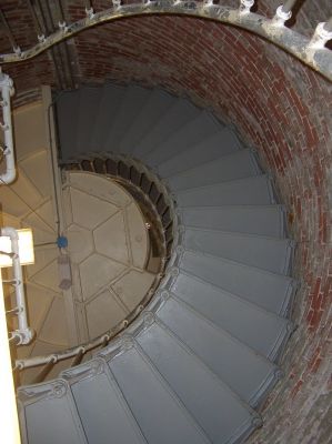 Wir wandern den kurzen Weg zum Lighthouse hinauf. Eigentlich haben wir keine Besichtigungstour geplant, aber als wir die urigen Seebären erleben, die die Führungen machen, entscheiden wir uns doch dem Leuchtturm einen Besuch von Innen abzustatten. Blöd nur, dass wir ausgerechnet bei der einzigen Frau landen, die den Witz einer pensionierten Handarbeitslehrerin hat. Neidvoll hören wir wie die anderen Grüppchen (immer nur ein paar Personen) immer wieder in Gelächter ausbrechen, naja, "trotzdem" ein Foto vom Treppenhaus: