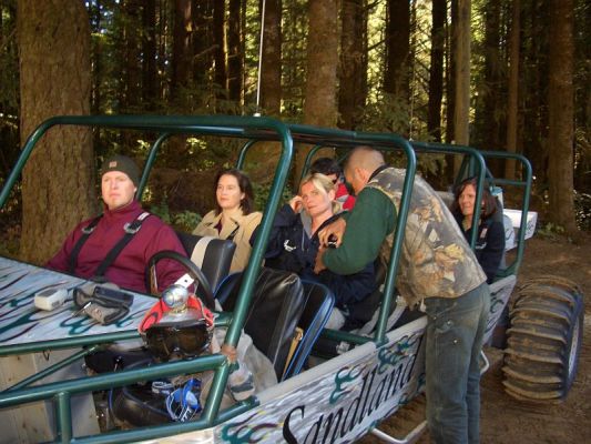 Allerdings finde ich es ja schon wenig vertrauenerweckend, dass man zunächst auf einen abgelegenen schlammigen Waldparkplatz fahren muss. Dort sehen wir dann auch schon das Vehikel, das uns soooo viel Spaß bringen soll.