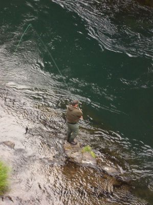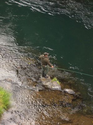 Obwohl Herr Barb eigentlich lieber ein bisschen auf der Hütte abhängen möchte, nötige ich ihn noch zu einem Spaziergang am Fluß entlang. Ich gehöre ja eher zur ungeduldigen Fraktion, hier allerdings kommt mir Fliegenfischen als sehr erstrebenswerte Sportart vor.