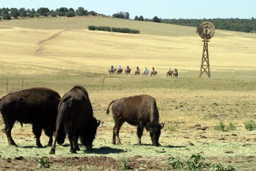 Doch die Bisonherde ist eingezäunt und die „Cowboys“ sind nur Touristen, die von einem Guide (auf einem Maultier) geführt  werden.