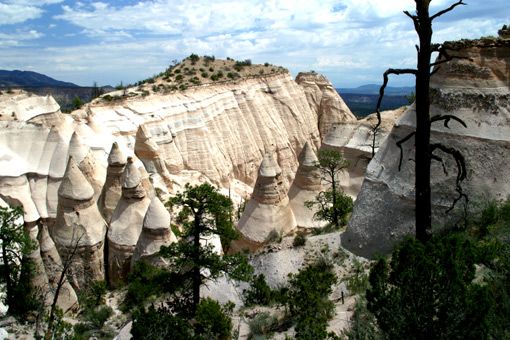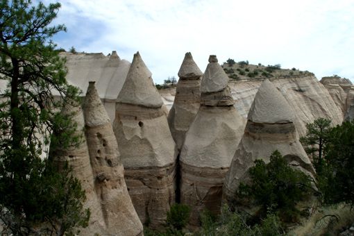 Erst 2001 zum National Monument "befördert", gelten die Tent Rocks heute noch als Geheimtipp. Um so mehr sind wir überrascht, dass wir nach 5 Meilen Gravel-Road am Trialhead fast ein Dutzend Fahrzeuge antreffen. Des Rätsels Lösung: Eine Geologie Klasse der Universität von New Mexico ist auf Exkursion und erforscht die einzelnen Schichten der Formationen. Wir entscheiden uns für den 1,5 Meilen langen Canyon Trial und sind mal wieder restlos begeistert. In der Sprache der Ureinwohner bedeutet Kasha Katuwe, weiße Kliffs. Und so empfangen uns die von der Sonne angestrahlten Formationen in einem fast strahlendem Weiß. Der Trial führt durch einen kleinen Slot-Canyon und wir müssen unter einem herabgestürzten Felsen hindurch. Am Ende des Slots erwartet uns ein Felsen, in dem die Kinder den Kopf eines Dinos wiedererkennen.