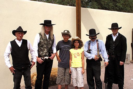 Die beiden Cowboys in der Mitte gehören zur Famile.An der Stelle wo der Gunfight stattgefunden haben soll, war die Situation „authentisch“ mit Puppen nachgestellt – halt US-amerikanisch. Darüberhinaus konnten verschieden Kutschen, ein Cowboy Bunkhouse, ein „original Corral Office“, eine Prostitute’s Crib, ein altes Foto Studio und Fly’s Boarding House besichtig werden. Danach schauten wir uns noch die Räumlichkeiten an, in denen der Tombstone Epitaph gedruckt wurde und wo verschiedene alte Druckmaschinen ausgestellt waren. Hier bekamen wir auch die alten Ausgaben der Zeitschrift ausgehändigt, die mich mehr als die ganze Show interessierten.