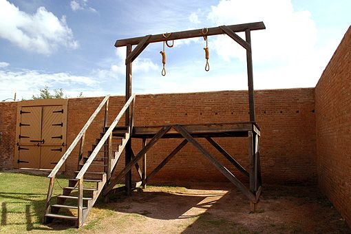 Zum Abschluss gab’s dann im Tombstone Courthouse noch ein wenig Geschichtsunterricht, bei dem die Show eher im Hintergrund stand. Erbaut im Jahre 1882 für 50.000 $ beherbergte das Bauwerk die Amtsräume des Sheriffs, des Gerichts, des Kämmerers und des Bezirksverwalters. Nachdem Bisbee 1929 Bezirkshauptstadt wurde, machte 1931 auch die letzte Dienststelle dicht. Später sollte in dem Haus ein Hotel untergebracht werden, in den fünfigre Jahren richtet man das historische Museum ein. Heute können zahlreiche Exponate aus Tombstones Vergangenheit, der originale Gerichtssaal (mit Spucknäpfen !) und im Hof ein Galgen besichtigt werden.