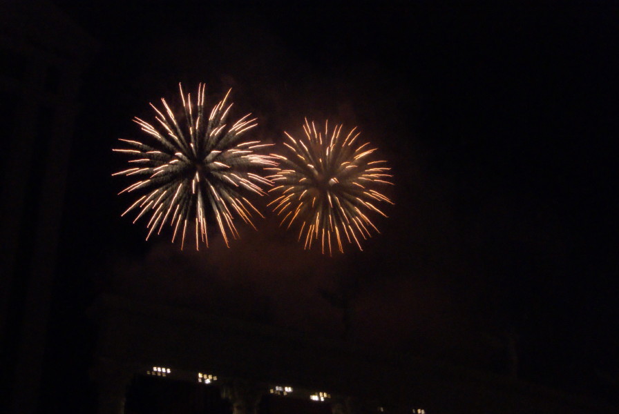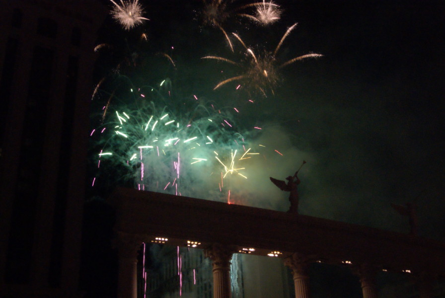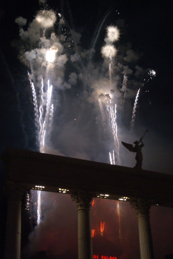 Bei der Gelegenheit treibt Patrick noch einen Zylinder auf, den wohl irgendjemand vergessen hat. Das rettet ihn vor irgendwelchem Blinki-Kram und Mitternacht kann kommen.. Zum Anstossen brauchen wir aber noch was zu trinken. Also wieder zur Bar vorm CP.. dort ist allerdings eine lange Schlange und nur ein Barkeeper. Es ist 3 Minuten vor 12, als wir unsere Drinks (spanish Lemonade) in Händen halten. Starke Drinks mit Bacardi, Wodka, Tequila, Smirnof und was-weiß-ich-noch.. Jetzt bleibt keine Zeit mehr, sich einen guten Platz für's Feuerwerk zu sichern. Schon läuft der Countdown.. und dann HAPPY NEW YEAR!! Ein fast 10minütiges Feuerwerk auf dem Cesar's Palace treibt mir fast die Tränen in die Augen. Ich möchte nie wieder woanders Silvester feiern!