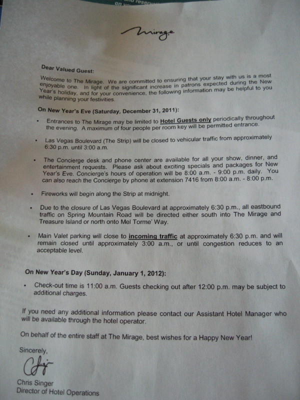 Zurück im Zimmer wünschen wir zunächst mal via sozialem Netzwerk halb Deutschland einen guten Rutsch, denn schließlich ist es in der Heimat schon später Abend. Der Zimmerservice hat auch eine Info über die Sperrung des Strip dagelassen: