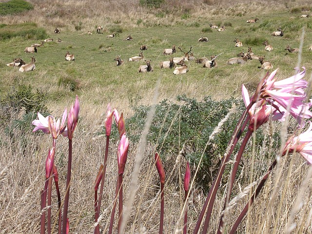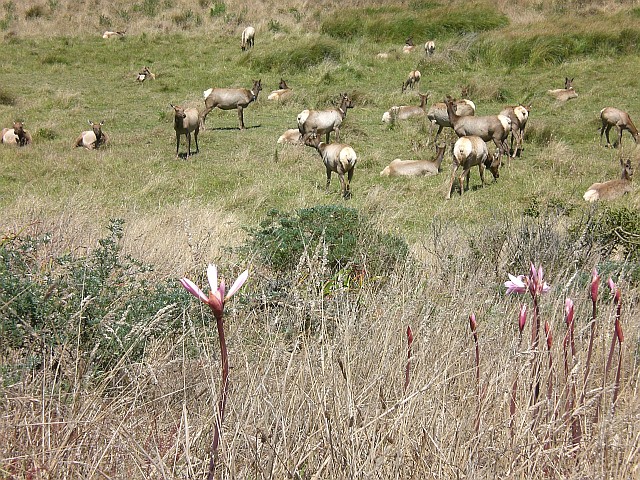 Da er zudem in einem Elch-Reservat liegt, kann man immer mit Elchsichtungen rechnen. Am Trailhead steht noch eine alte Ranch aus dem Jahr 1858, die will ich mir aber erst am Rückweg anschauen. Ich laufe also los, geniesse die Aussichten und sehe in der Ferne eine Elchherde. Schnell ein Foto schiessen, man kann ja nie wissen, ob das nicht die erste und zugleich letzte Sichtung ist, und weiter geht es Richtung Tomales Point. Nach einer halben Stunde biege ich um eine Ecke und sehe eine zweite Herde, die es sich direkt neben dem Weg gemütlich gemacht hat. Da ich keine Lust auf einen Elchtest habe, drossle ich mein Tempo, spaziere langsam auf die Herde zu und schiesse ein Foto nach dem andern. Toll!