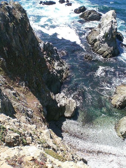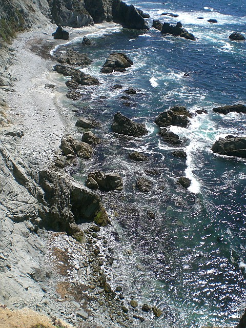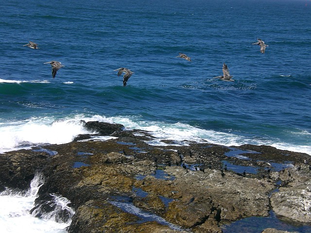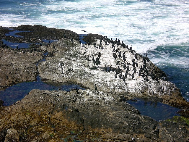 Nachdem ich an der Elchherde vorbei bin, nehme ich wieder Tempo auf. An manchen Stellen wird der Weg sandig, aber unterm Strich komme ich gut voran und bin 25 Minuten später am Tomales Point. Einfach herrlich! Ich schiesse Fotos aus allen möglichen Perspektiven und klettere dann hinunter zu den Vögeln, die es sich auf einem Felsen vor der Küste gemütlich gemacht haben. Dort bleibe ich gut 20 Minuten sitzen, geniesse wie Pelikanschwärme mir über den Kopf fliegen und beobachte das muntere Treiben der Seevögel.