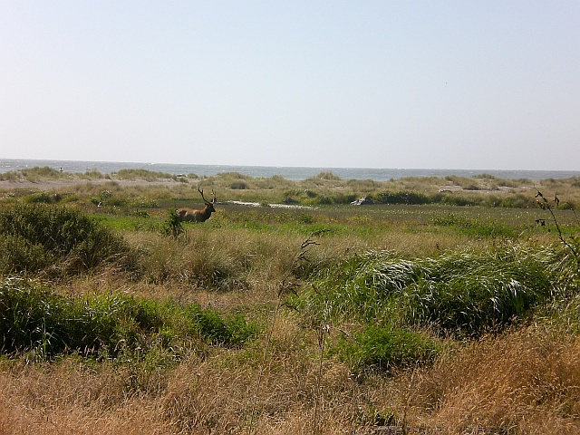Ich frage mich, ob der Fern Canon die Fahrt wert ist. Ich bin da sehr skeptisch, denn die Bilder die ich bisher gesehen habe, sind nicht wirklich überragend. Überall wird er aber in höchsten Tönen gelobt und einer der Teilnehmer der Anchor Steam Brauerei-Tour vor zwei Tagen hat sogar am Bau des Trails mitgearbeitet. Am Strand angekommen muss ich zudem $6 für den Eintritt zum Park berappen, ich bin gespannt. Kaum aus dem Auto ausgestiegen und die ersten paar Schritte getan, orte ich schon das erste Highlight: Hier laufen doch tatsächlich stattliche Hirsche am Strand herum. Einer erschreckt gerade ein paar Touristen die glauben, dass die Schilder “Nicht zu Fuss den Hirschen nähern” nicht für sie gelten, indem er ein Stück mit vollem Karacho auf sie zu läuft und dann stehen bleibt. Ich finde das auf jeden Fall relativ lustig. Währenddessen fotografiere ich den zweiten Hirsch, der sich das Treiben von der Distanz ansieht.