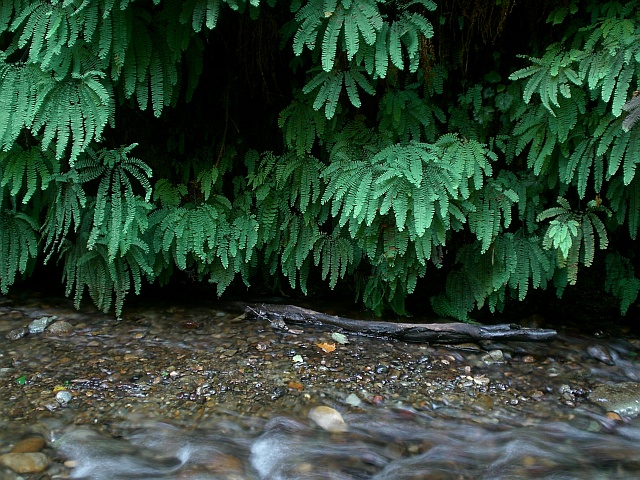 Ein paar Schritte weiter befinde ich mich schon im Fern Canon Was ich sehe ist zwar relativ nett, aber nicht wirklich toll. Halt ein Haufen Farn das links und recht an der Wand hängt. Da ich aber schon mal da bin schiesse ich ein paar Fotos und fahre dann entlang des Strandes und durch den Wald zurück zur befestigten Strasse.