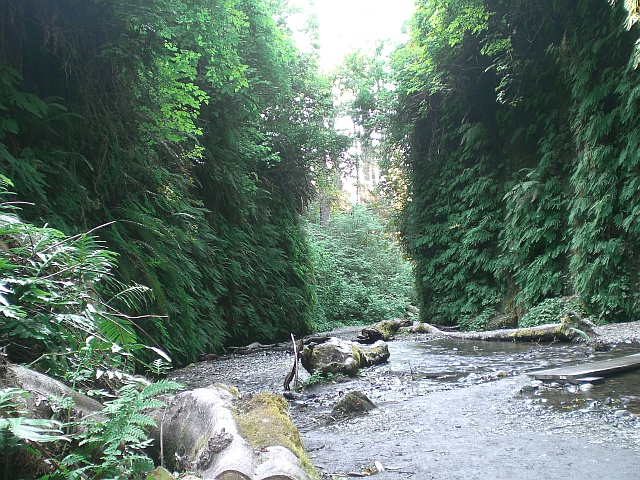Die Strasse zum Fern Canon führt über eine Dreckstrasse, erst durch den Wald hinunter zum Strand, dann diesem entlang und abschliessend durchquert man noch drei Bäche. Für selbige braucht man zwar kein Auto mit Schnorchel, aber ich kann mir vorstellen, dass die nach Regenfällen ordentlich Wasser führen. Teilweise ist die Strecke recht ruppig, aber das hindert scheinbar nicht viele daran, mit ihrem normalen PKW hinunter zu fahren. Der relativ grosse Parkplatz ist fast komplett voll. Sogar ein Miet-RV steht unten am Parkplatz, der Fahrer muss echt nicht ganz gebacken sein.