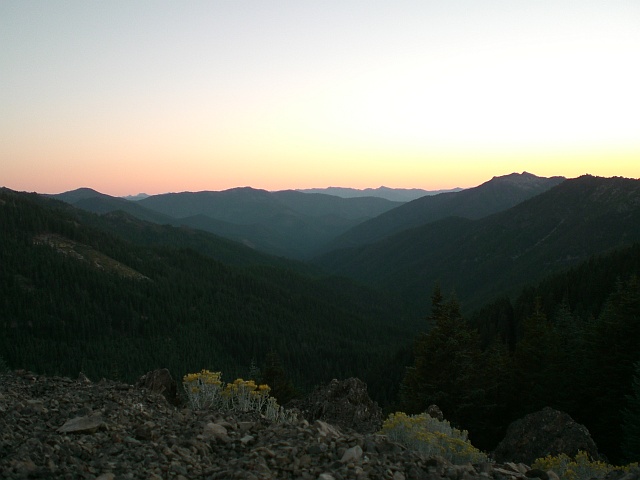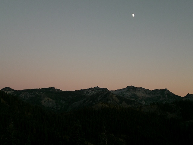 Es geht unspektakulär runter zum Bigfoot Scenic Highway. Unspektakulär deshalb, weil nach den Bald Hills links und rechts Bäume die Strasse säumen und man ausser der Strasse nichts sehen kann. Der Bigfoot Scenic Highway gibt schon mehr fürs Auge her, und als ich dann vor Somes Bar auf die Salmon River Road abbiege bin ich restlos begeistert. Die Farben, einfach grossartig! Dieses gelbe Gras, braune Felsen, rote Erde, grüne Bäume und der wilde Salmon River als ständiger Begleiter, einfach grossartig! Ich kann mich gar nicht satt sehen. Schade nur, dass die Sonne schon tief steht und nicht mehr bis ins Tal hinunter scheint. Deswegen gelingen auch keine Fotos, die das geschriebene widerspiegeln können. Als ich dann bei Forks of Salmon auf die Sawyers Bar Road abbiege trifft mich vor Begeisterung glatt der Schlag: Die Strasse ist nun einspurig, schlängelt sich kurvenreich ohne irgendwelche Leitplanken hoch oberhalb des Flusses entlang. Das in Kombination mit dem Farbenspiel macht einfach Spass und Laune zum Fahren, obwohl ich schon so lange unterwegs bin. Wirklich grossartig! Als ich mich langsam Etna nähere habe ich erst das Gefühl, dass die Landschaft nun nachlässt, doch dann windet sich die Strasse steil nach oben und führt über einen Pass von dem ich noch im letzten Licht den Mond über den Trinity Alps und bewundern kann. Auch die Marble Mountain Wilderness ist mehr als einen Blick wert. Fantastisch, in die Gegend werde ich sicher noch einmal kommen!