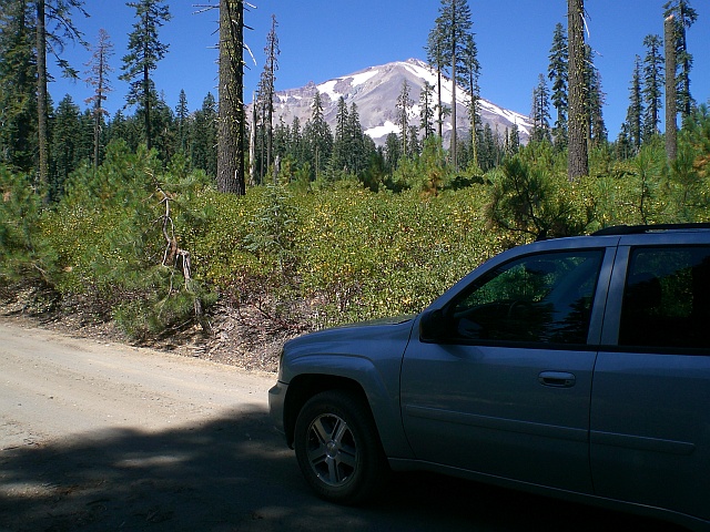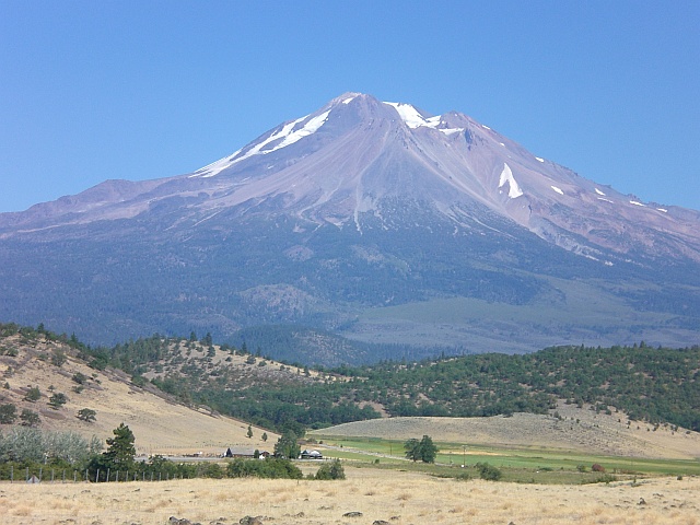 Nach etwas mehr als einer Stunde treffe ich gegen 14.30 Uhr beim Auto ein. Dort inspiziere ich meine geschunden Füsse, schmeisse den ganzen angehäuften Müll weg und bin erstmals einfach nur platt. Mit dem Auto brauche ich dann eine ganze Stunde bis ich wieder in Mount Shasta eintreffe. Dort beschliesse ich, zurück nach Yreka zu fahren, um mir eine Dusche zu gönnen. Auf dem Weg zurück halte ich noch an, um ein paar Fotos vom Mount Shasta und der sandigen Piste zu schiessen.