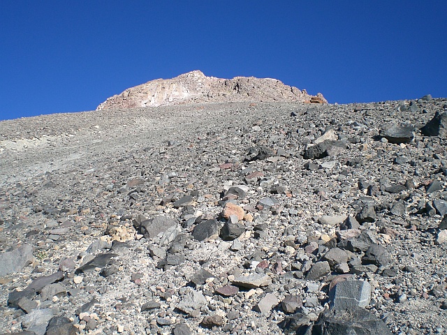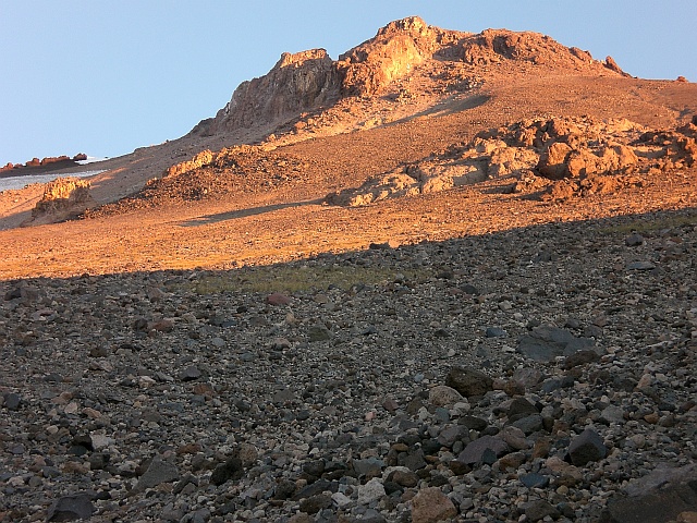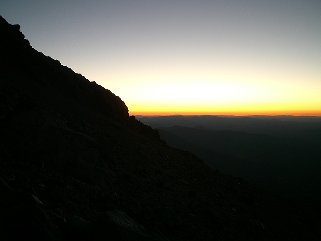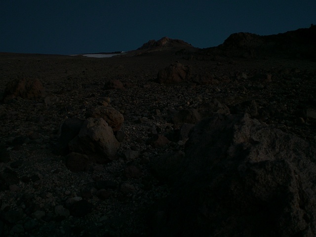 Verläuft die Route zu Beginn noch einigermassen im Sinne eines Wanderweges mit nicht allzu extremen Steigungen, entwickelt sie sich langsam zu einer Bergsteigerroute. Nicht dass es sich um eine technische Route handelt, aber es wird ganz schön anstrengend. Der Untergrund wird nämlich immer loser und das Weiterkommen ähnelt immer mehr dem Erklettern eines Kieshügels. Nach fast jedem Schritt rutscht man wieder die Hälfte der Distanz nach unten. Wenn man dazu noch nicht einmal die Landschaft geniessen kann weil es einfach nur stockdunkel ist und man mit der Stirnlampe immer wieder nach dem Verlauf des Trampelpfads suchen muss, dann ist das schon sehr zermürbend. Immerhin kann ich aufgrund der nicht vorhandenen Lichtverschmutzung links des falschen Gipfels (der wahre Gipfel des Mount Shasta ist zwar nur wenige Meter höher, verbirgt sich aber komplett dahinter) die Milchstrasse ausmachen. Auch kein schlechter Anblick! Nach etwa zwei Stunden Qual im Dunkeln setzt so langsam die Blue Hour ein und die Route ist auch ohne Stirnlampe auszumachen.