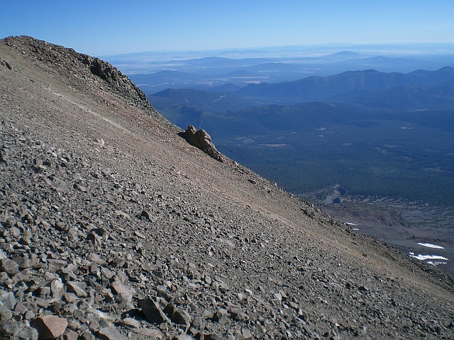 Inzwischen ist es mir fast schon zu warm, und der Fleece Pulli wandert erstmal ab in den Rucksack. Was das Trinken anbelangt, halte ich mich ordentlich zurück und rationiere das Wasser, sprich ich trinke weniger, als es mein Durst verlangt. Ich denke mir, dass mir ein halber Liter Wasser gerade noch genügen dürfte, um von der Spitze zurück zum Clear Creek Camp zu kommen. Solange dieser halbe Liter nicht erreicht ist, muss ich nicht umkehren. Rechts von mir geht im Osten inzwischen die Sonne auf. Da ich keine Sonnencreme dabei habe, werde ich bald hinsichtlich eines möglichen Sonnenbrandes aufpassen müssen. Anhand des Horizonts kann man gut erkennen, wie steil es ist.