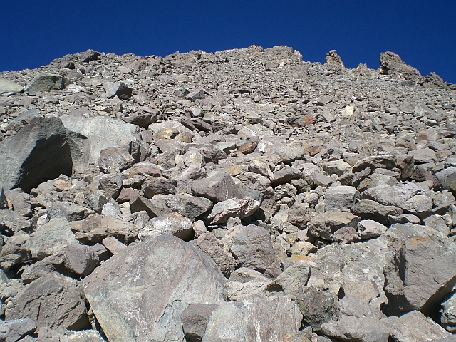 Ganz langsam quäle ich mich den Berg hinauf, immer wieder den Blick nach unten und nach oben. Immer wenn ich pausieren muss achte ich darauf, mit dem Rücken zur Sonne zu stehen, um ja keine Sonne abzubekommen. Mein Nacken wird dabei vom Rucksack geschützt. Endlich beim Stein angekommen pausiere ich erstmal länger und muss im Zuge dessen bereits mit der zweiten Flasche Wasser beginnen. Ich habe inzwischen einen enormen Durst und würde die Flasche am liebsten an Ort und Stelle austrinken. Stattdessen esse einen Apfel, um daraus ein wenig Flüssigkeit zu gewinnen. Der Blick vom Stein ist auch nicht gerade sehr aufmunternd. Eine Route gibt es schon länger nicht mehr sondern ich kämpfe mich einfach so gut es geht auf dem steinigen Untergrund vor. Die Steine sind inzwischen grösser geworden und es wird nicht nur wegen der Höhenmeter immer anstrengender. Jeder Stein gibt nach, man kann sich nirgends festhalten. Selbst die grösseren Steine geraten ins Rutschen, wenn man einen Fuss auf sie setzt. Nirgends kann man sich festhalten. Ich peile die zwei Rinnen zwischen den drei Türmen vor mir an. Inzwischen gehe ich schon auf allen Vieren. Man kann anhand des Horizonts auch gut beurteilen, wie steil die Route doch ist.