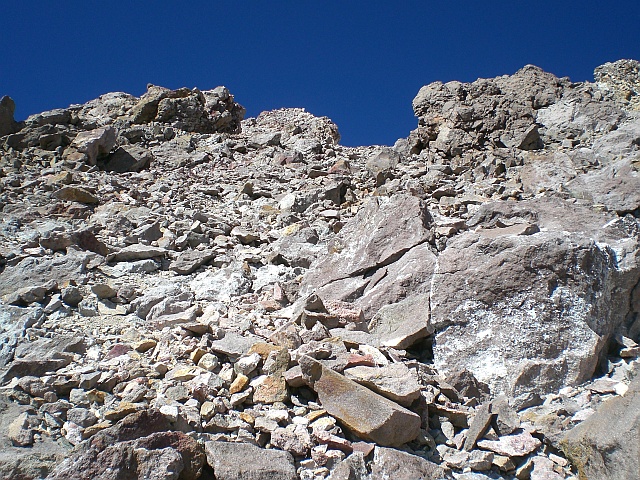 Inzwischen habe ich schon ordentlich Höhenmeter gemacht deshalb bin ich guter Dinge, auch mit dem begrenzten Vorrat an Wasser die Spitze zu erreichen. Eine mögliche vorzeitige Umkehr kommt mir nicht realistisch vor. Ab einer Höhe von 3′500 m wird das Atmen jedoch immer schwerer. Man muss regelrecht jedes bisschen Sauerstoff aus der Luft saugen. Die Route ist inzwischen nur noch steil, der Untergrund gibt ständig nach, jeder Schritt mit der darauf folgenden Rutschrei ist nur noch anstrengend. Ich muss alle 30 Sekunden kurz stehen bleiben, um nach Luft zu schnappen. Irgendwie macht es den Anschein, als ob dieser angepeilte Stein einfach nicht näher kommt.