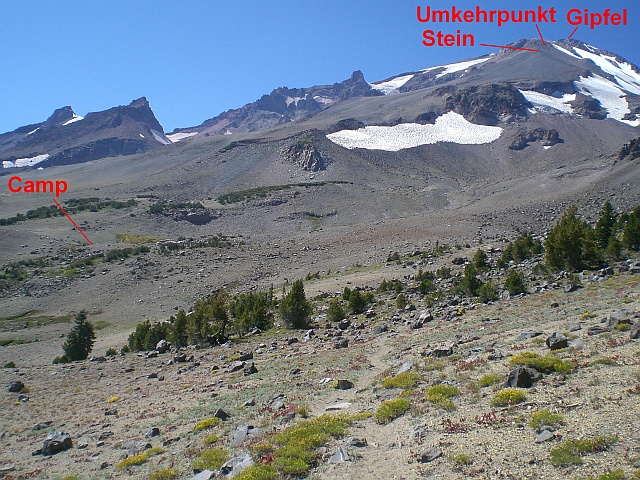 Auch der Abstieg ist anstrengend, weil einfach alles nachgibt auf das man tritt. An einer Stelle stehe ich mit beiden Füssen auf einem Stein und rutsche für einige Meter das Geröll runter wie auf einem Surfbrett! Das war nicht beabsichtigt und eine relativ haarige Angelegenheit! Etwa 1 1/2 Stunden später und fast dehydriert erreiche ich endlich wieder Clear Creek Camp. Inzwischen sehe ich auch ein zweites Zelt dort stehen und werde von einem Wanderer Ende 50 gleich neugierig nach dem Zustand der Route gefragt. Ich erwidere, dass ich fast verdurstet sei und erstmals Wasser pumpen und vor allem trinken müsse. Nach Pumpen des ersten halben Liters kann ich nicht länger warten und stürze diesen sogleich hinunter. Wahrscheinlich das beste Wasser, das ich jemals getrunken habe! Nach Pumpen eines weiteren Liters habe ich Zeit und Energie für die neugierigen Fragen bezüglich der Route. Anhand der Karte beschreibe ich Verlauf und Zustand der Route und zeige, wo ich umkehren musste. Er meint, ich solle mich nicht ärgern, denn letztes Jahr habe er einen getroffen, der bereits vier erfolglose Versuche hinter sich gehabt habe und gerade beim Versuch Nummer fünf war. Nach etwa 20 Minuten mache ich mich daran, meine Habseligkeiten zusammenzupacken, um mich für den Abstieg zum Auto vorzubereiten. Sonnencreme hat der Mann leider auch keine dabei. Er warte auf seinen Sohn, der würde dann schon welche mitbringen. Toll! Ganz am Schluss der Packerei habe ich nur noch meinen Trinkbecher in der Hand, der in der einzigen von aussen zugänglichen Tasche des Rucksacks keinen Platz mehr findet. Weil ich keine Lust habe, deswegen extra den Rucksack wieder zu öffnen, möchte ich den Becher eben in die aussen angeschnallte Box mit dem Paar Steigeisen stopfen. Die ist dazu da, dass die scharfen Steigeisen nichts beschädigen können. Als ich die Box öffne, trifft mich fast der Schlag! Da liegt doch ganz stinkfrech die Sonnencreme drinnen. Ich schimpfe wie ein Rohrspatz und kann mich gar nicht entscheiden, ob ich mich darüber ärgern soll, dass ich vergessen habe, wo die Sonnencreme ist, oder ob ich mich darüber ärgern soll, dass ich, wenn ich alles durchsuche, nicht wirklich alles durchsuche. Sei’s drum, ich gönne meinem Gesicht und vor allem der Nase ein wenig Sonnencreme und mache mich dann an den Abstieg. Auf die zwei verbleibenden Biere in Bach habe ich keine Lust mehr und überlasse sie dem wissbegierigen anderen Wanderer.