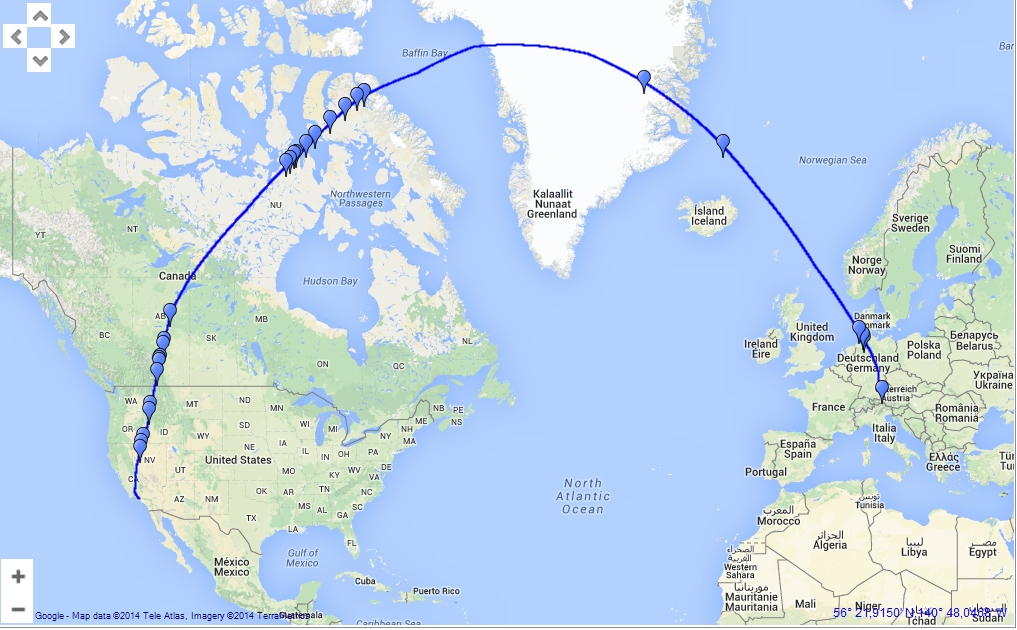 Die Flugroute habe ich mit einem billigen GPS-Tracker verfolgt, der am Kleiderhaken neben dem Fenster hing. Die Markierungen sind manuell ausgelöst an Stellen, wo ich fotografiert hatte. Eigentlich wäre das nicht notwendig gewesen, weil sich die Fotos mit der Aufnahmezeit synchronisieren lassen - was mir allerdings erst zuhause nach einiger Herumprobiererei gelungen ist (das zugehörige Programm ist nur begrenzt intuitiv gestaltet; außerdem muß man die Zeitzonen anpassen). Immerhin hat sich auf diese Weise bestätigt, daß manuelle Fotopunkte und synchronisierte Aufnahmepositionen übereinstimmen :).