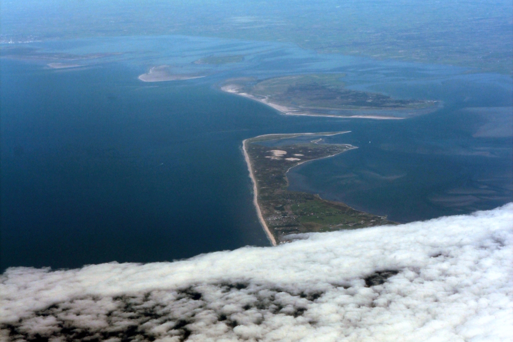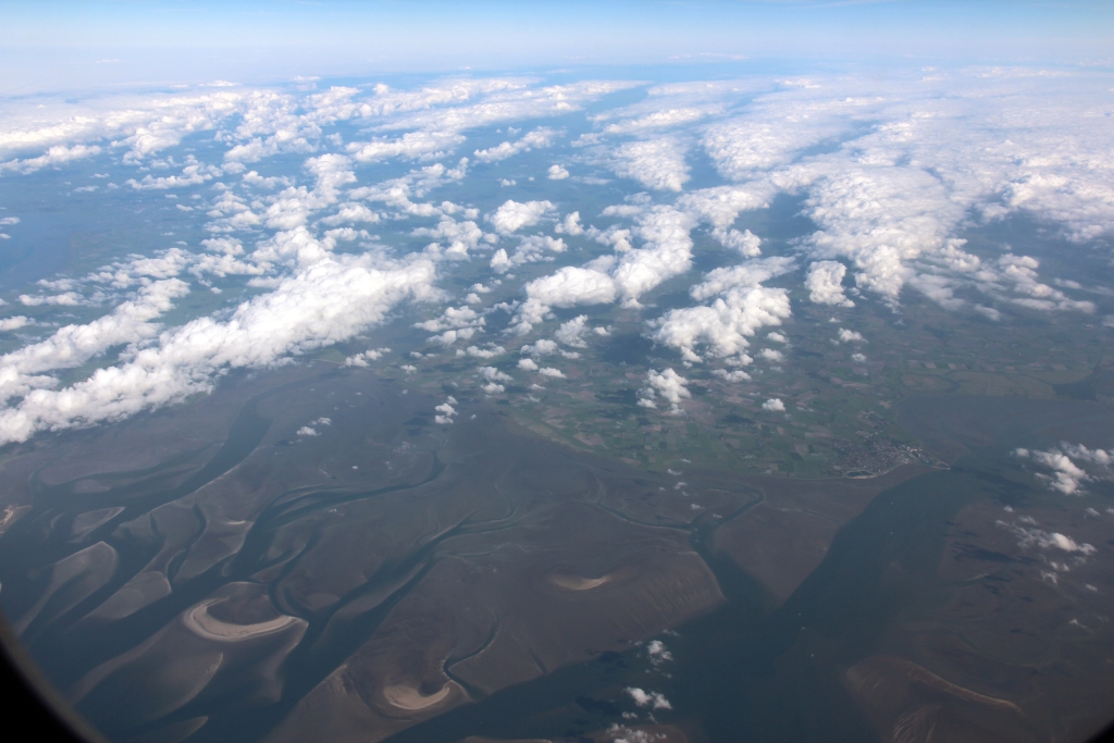 Das Boarding beginnt pünktlich um 11:35, ebenso das Ablegen vom Finger. Wir fliegen laut Bildschirm zunächst einen ziemlich konsequenten Nordkurs, später Nordnordwest. Allerdings ist durch die dichte Wolkendecke nur wenig zu erkennen. Über Hessen und Niedersachsen gibt es zwar einige Löcher, aber wenig markante Stellen. Vor Hamburg wird wieder alles dicht; das Wattenmeer und Sylt sind dann aber gut zu erkennen, anschließend noch etwas Nordsee und das war's dann fürs erste.