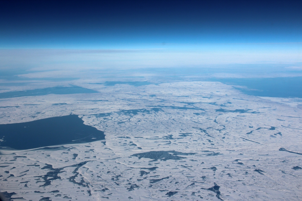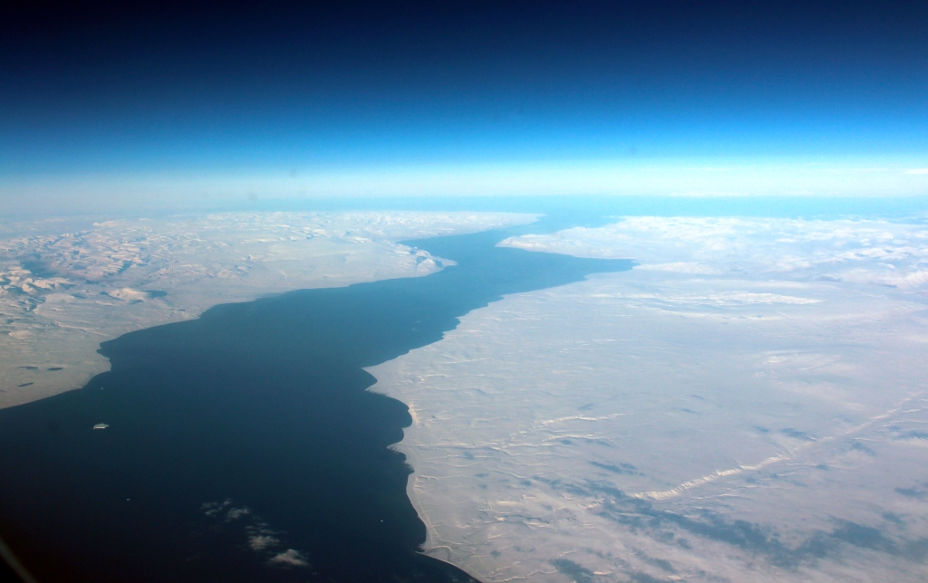 Vor Kanada klart es auf. Immer wieder linse ich durch die Bin, um zu fotografieren. Der Blick auf Baffin Island und die anschließende Bucht ist einfach genial. Als der Bordservice Kaffee und Kuchen (kleine Apfelschnittchen) bringt, mache ich endgültig auf, um die Landschaft zu genießen, während sich Marianne noch Fading Gigolo mit Woody-Allen anschaut. Leider trübt es sich vor dem kanadischen Festland wieder ein.
