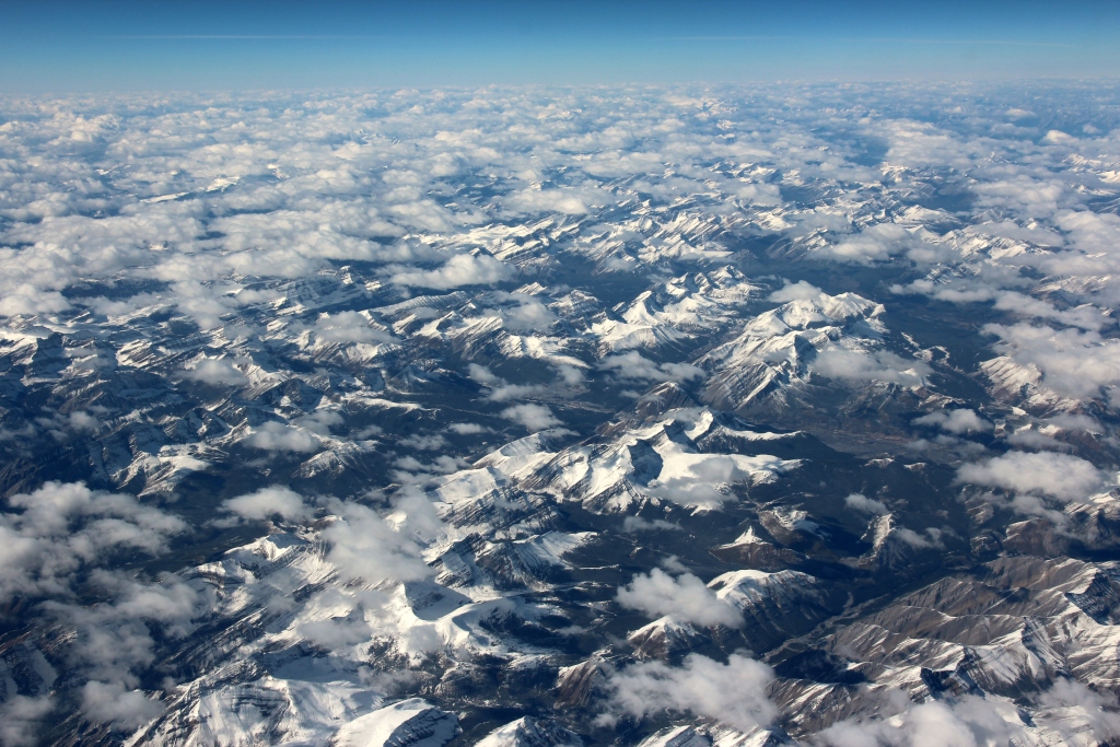 Vor den Rocky Mountains sieht man dann wieder die Landschaft. Wir überqueren die Berge beim Banff National Park. Aus der Ferne kann man später Mt. Rainier, Mt. Hood und Mt. Shasta erahnen. Die Salzpfannen bei Winnemucca sowie Lake Pyramid und Lake Tahoe sind direkt neben uns. Über Yosemite fliegen wir direkt drüber, so daß man senkrecht nach unten hätte schauen müssen, um das Tal zu sehen.