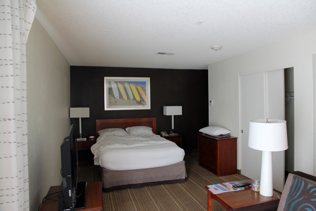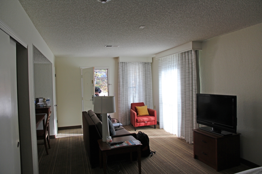Das Navi hat zwar schnell erkannt, wo wir sind. Nachdem wie schon befürchtet bei der Ausfahrt von Hertz kein Linksabbiegen zulässig war, bedarf es dennoch einigen Hin und Hers (inklusive einem vermuteten Rotlichtverstoß), um zum Target zu finden. Dort erledigen wir die dringendsten Grundeinkäufe (Sam Adams, Coke Zero, Bananen usw.). Die nächsten 200 Meter zum Residence Inn sind dann kein Problem mehr. Da es noch hellichter Tag ist, finden wir anders als vor drei Jahren auch gleich die Einfahrt und beziehen unser riesiges Zimmer.