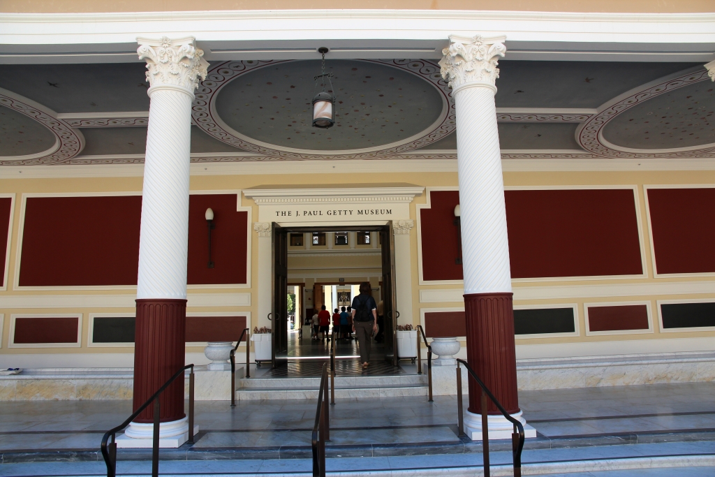 Wir sind gegenüber unseren Plänen ohnehin schon ein wenig verspätet. Bevor wir losziehen können, muß ich aber erst noch nach dem Navi suchen, das in der nächtlichen Umzugsaktion einen ungewöhnlichen Aufenthaltsort eingenommen hat. So kommen wir erst nach 8:20 los und geraten gleich in der ersten dichten Verkehr, der sich immer wieder staut. Wir streichen daher den Umweg zum AAA in Santa Monica, wo ich Karten und Tourbooks mitnehmen wollte. Statt dessen fahren wir direkt zur Getty Villa, wo wir nur kurz vor unserer ersten gebuchten Zeit von 09:00 eintreffen (man muß sich für eine bestimmte Zeit im Halbstundenabstand voranmelden; das wird auch tatsächlich kontrolliert. Ich hatte per Internet die zwei ersten Zeitfenster – 09:00 und 09:30 – getrennt auf unsere beiden Namen gebucht).
