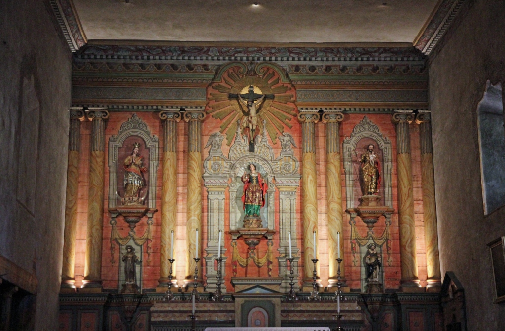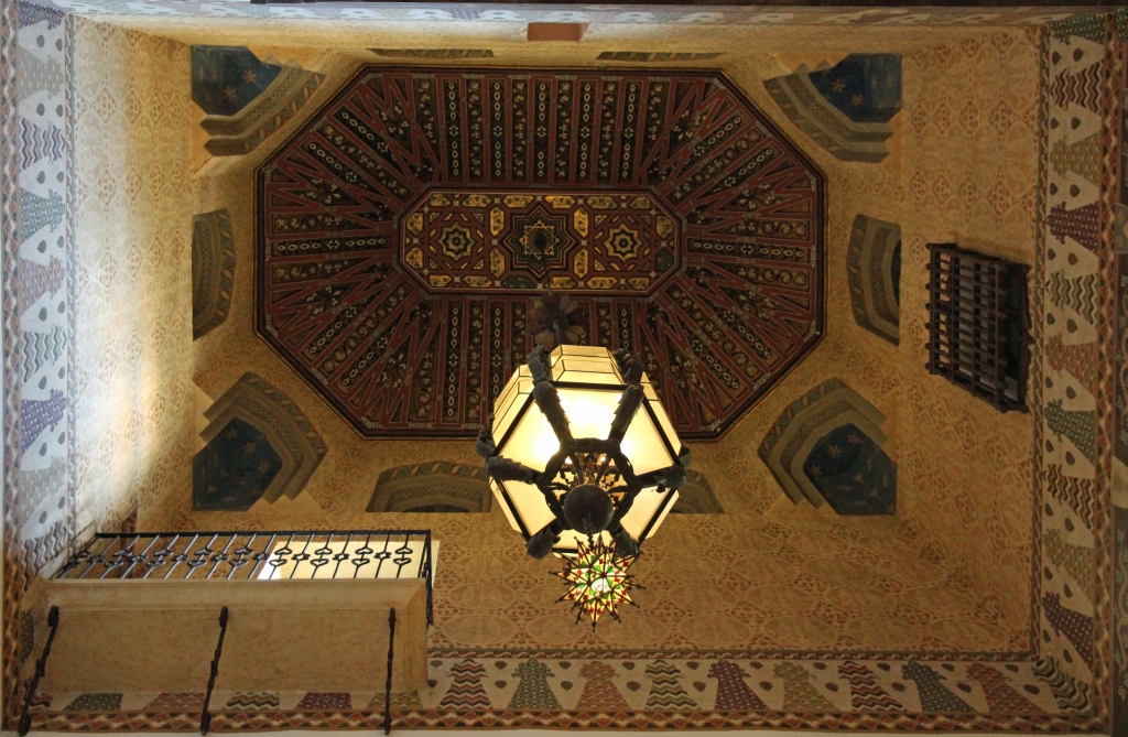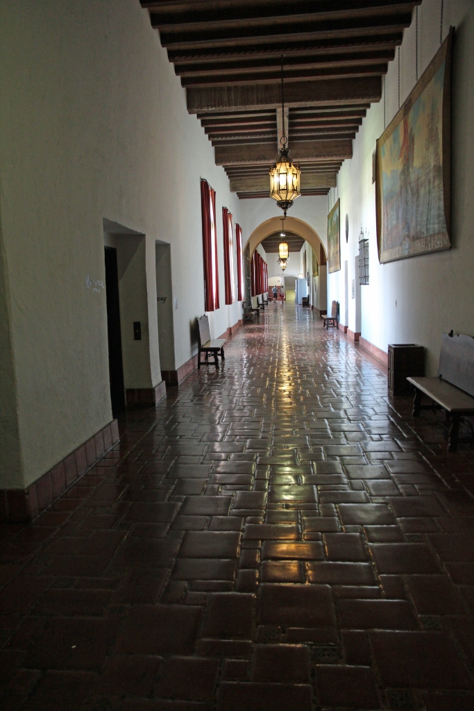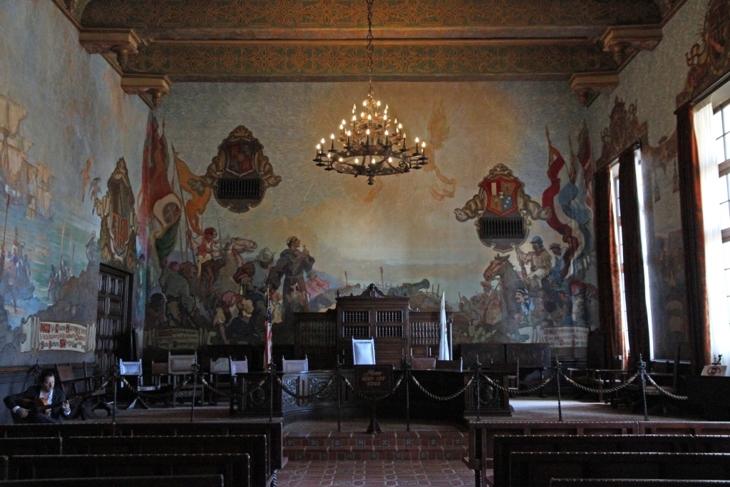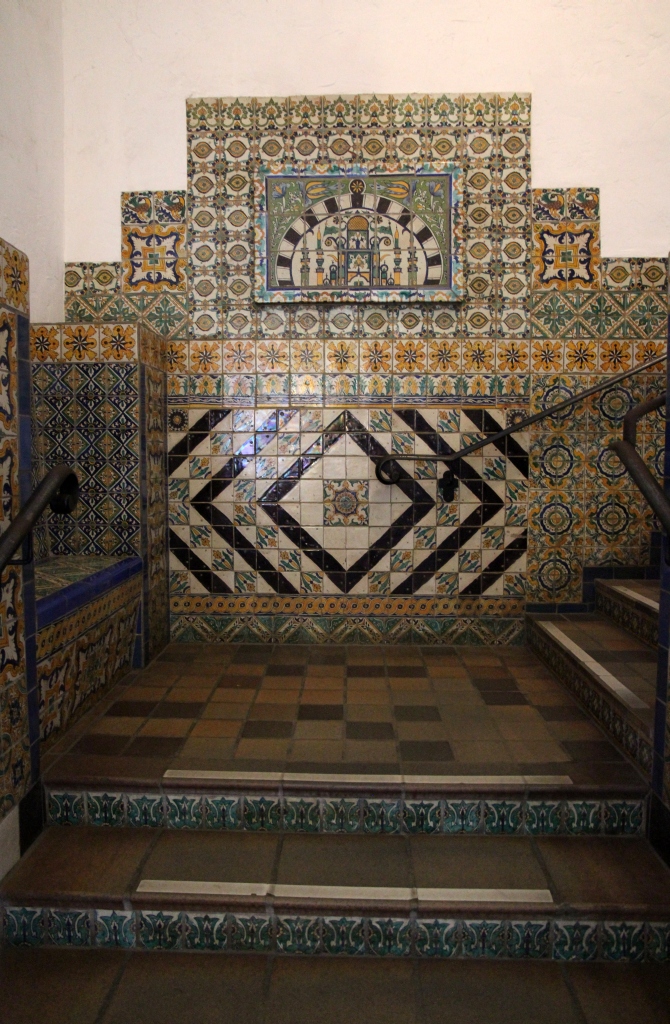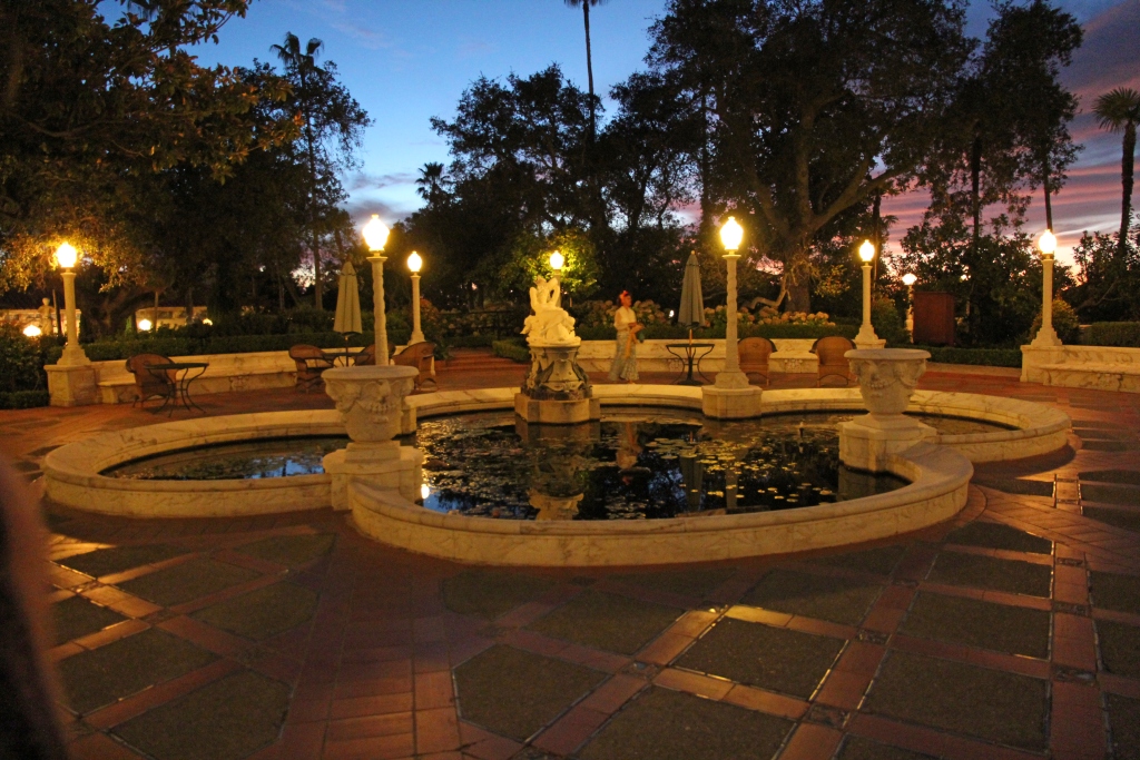 Zunächst aber erleben wir im Garten und Poolbereich einen phänomenalen Sonnenuntergang. Der Pool ist allerdings wegen der Wasserknappheit nicht gefüllt. Dann geht es in die Gebäude rein, erst in eines der als Gästehaus dienenden Nebengebäude, dann in das Haupthaus. Alles ist sehr aufwendig eingerichtet, aber für unseren Geschmack halt viel zu viel Schwulst, zwischen dem sich etliche sehr schöne Kleinode befinden, die aber von der Schwere der Gesamteinrichtung überdeckt werden. Dennoch sollte man es einmal gesehen haben, wenn man schon in der Gegend ist. Ein Kuriosum am Rande: Da sitzen bzw. laufen dutzende von Komparsen herum, die in zeitgenössischen Kostümen Gäste von Hearst mimen – eine wohl nicht allzu anspruchsvolle, aber auf die Dauer wohl auch eintönige Beschäftigung. Nach der Besichtigung einer Unzahl von Räumlichkeiten von der Küche über private Schlafgemächer bis zu Konferenz-, Bibliotheks- und Speisezimmern geht es über den pseudo-römisch ausgestatteten Innenpool wieder zurück zum Bus.