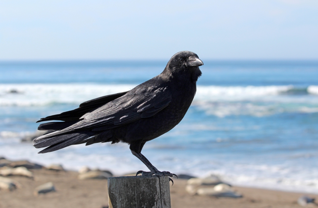 Zurück am Auto starten wir unseren Weg nach Norden. Unser erster längerer Stop findet an der See-Elefanten-Kolonie statt. Es sind gar nicht so wenige da, wie ich von der Jahreszeit her befürchtet hatte, Außerdem setzt sich ein Rabe direkt vor uns auf den Zaun und ein paar Geier (?) ziehen auch unmittelbar über uns hinweg. Die See-Elefanten sind im Süden vom Parkplatz - wenn man nach Norden schaut, hat man einen schönen Blick auf das Piedras Blancas Lighthouse.