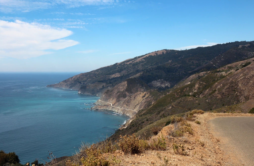 Von dort folgen wir dem Hwy 1 nach Norden mit seinen vielfältigen Ausblicken auf  die Pazifikküste. Ein Abstecher führt uns auf die Nacimiento - Fergusson-Road, eine aussichtsreiche knapp zweispurige Straße, die tolle Blicke auf den Pazifik und stellenweise auch auf den Hwy 1 eröffnet. Im unteren Teil verläuft sie durch lichten Wald, dann durch teilweise aride Hügel mit Kiefernbewuchs. Nach ca. 4 Meilen ist der wohl beste Aussichtspunkt erreicht und wir kehren um und fahren den Hwy 1 weiter bis zum Julia Pfeiffer Burns State Park.