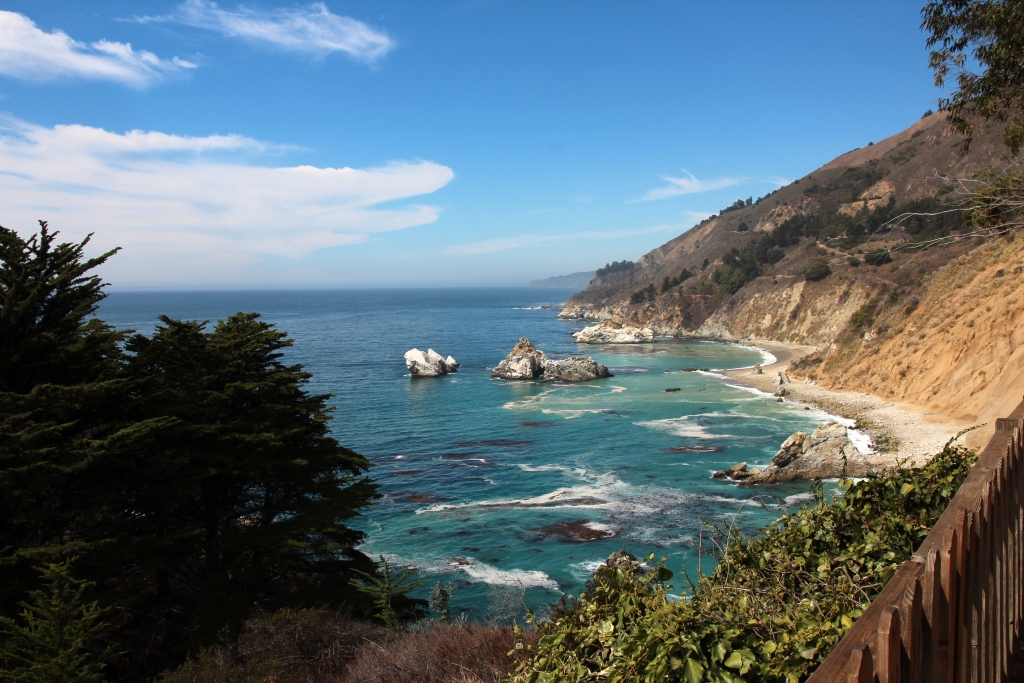 Wir essen verschiedene Salate und trinken (außer einem Pellegrino) je ein (kleines) Glas Rosé. Da es schon recht spät ist, verzichten wir auf den zweiten Pfeiffer-State-Park und fahren abgesehen von einigen Fotostops an der malerischen Küste direkt nach Carmel