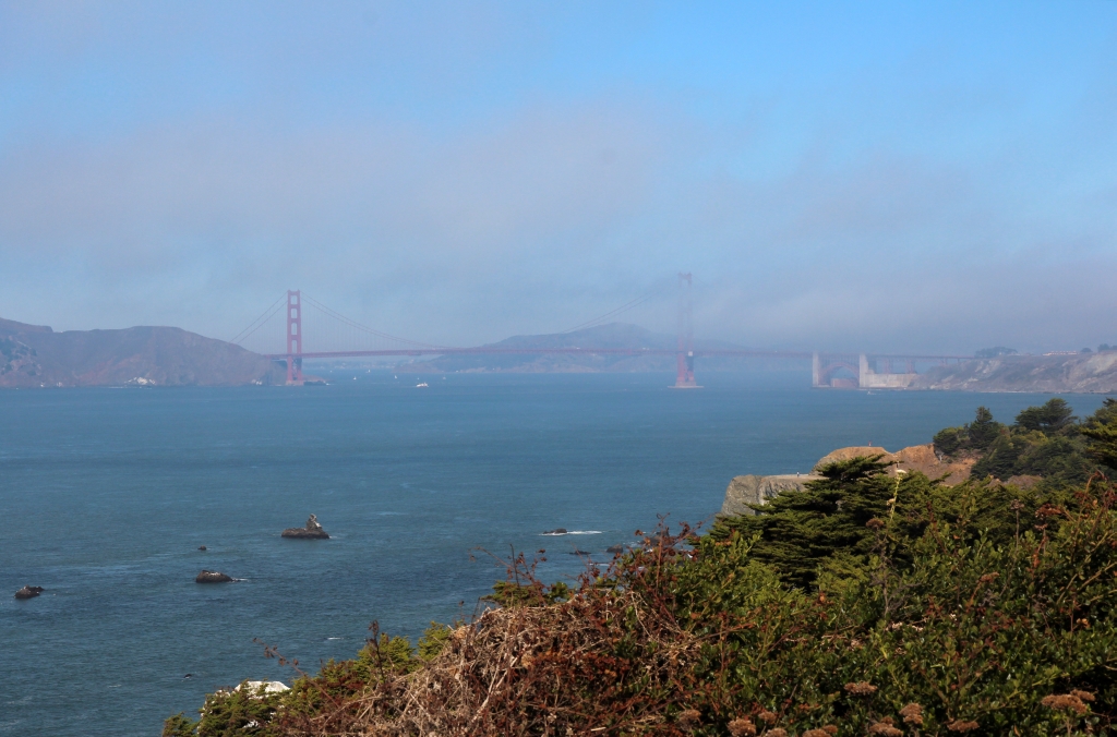 Nach dem Essen herrscht immer noch Nebel. Wir fahren weiter zum Point Lobos Parkplatz, wo es schon allmählich aufklart. Als erstes kaufen wir den Annual Pass "America the Beautiful" für die Nationalparks, Marianne bekommt noch eine Tafel mit kalifornischen Wildblumen. Dann marschieren wir ein wenig den Coastal Trail entlang bis zum Eagle’s Point. Schon von unterwegs und erst recht dort genießen wir traumhafte Ausblicke auf Golden Gate und Marine Headlands. Der Weg ist angenehm zu gehen, die Luft ist frisch, aber nicht mehr kalt – insgesamt ein schöner und erholsamer Ausflug.