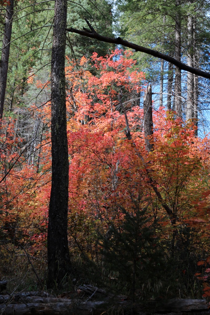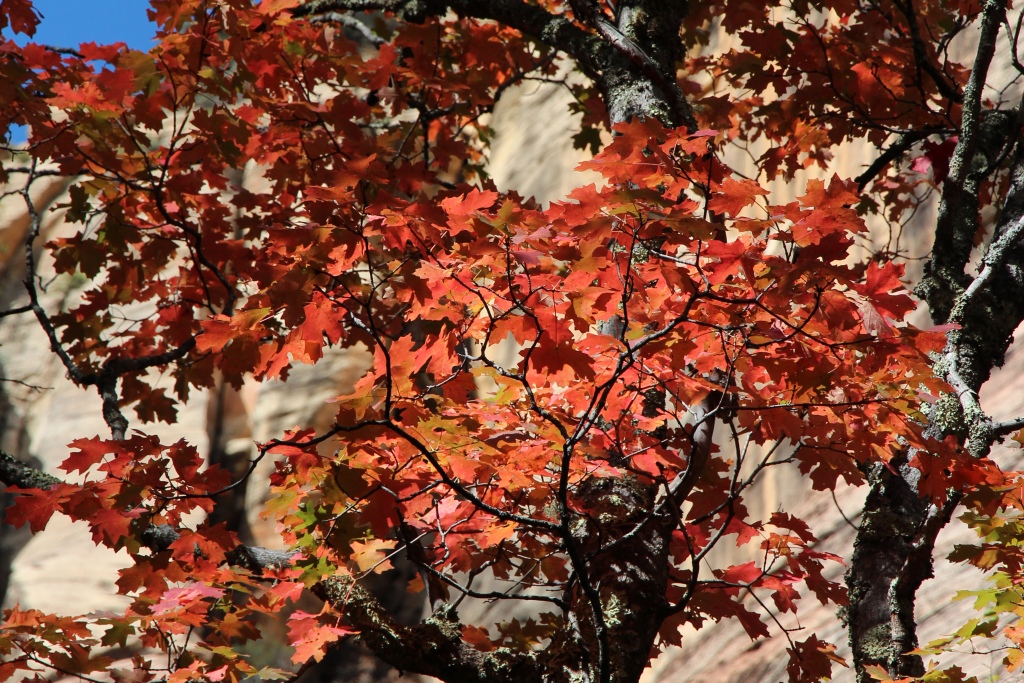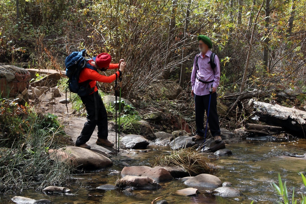 Der Weg ist angenehm, aber es herrscht ein Betrieb "wie am Stachus". Es geht viel durch Wald, was zum einen für Schatten sorgt, zum anderen das Photographieren der Felswände erschwert und schließlich an einigen Stellen wirklich schönes Herbstlaub bietet. Man hat laut Beschreibung dreizehn Bachüberquerungen über Steine zu bewältigen (ich habe zwar nicht nachgezählt, aber auf dem Rückweg jedesmal photographiert und komme auf vierzehn bis sechzehn, je nachdem, ob man die letzte Querungen im Talschluß mitzählt; in der Beschreibung steht aber auch "number of crossings can change") – nicht schwierig, aber halbwegs ordentliches Schuhwerk ist schon sinnvoll. Unterwegs genießen wir schöne Blicke auf Felsen und einige schöne Laubfärbungen.