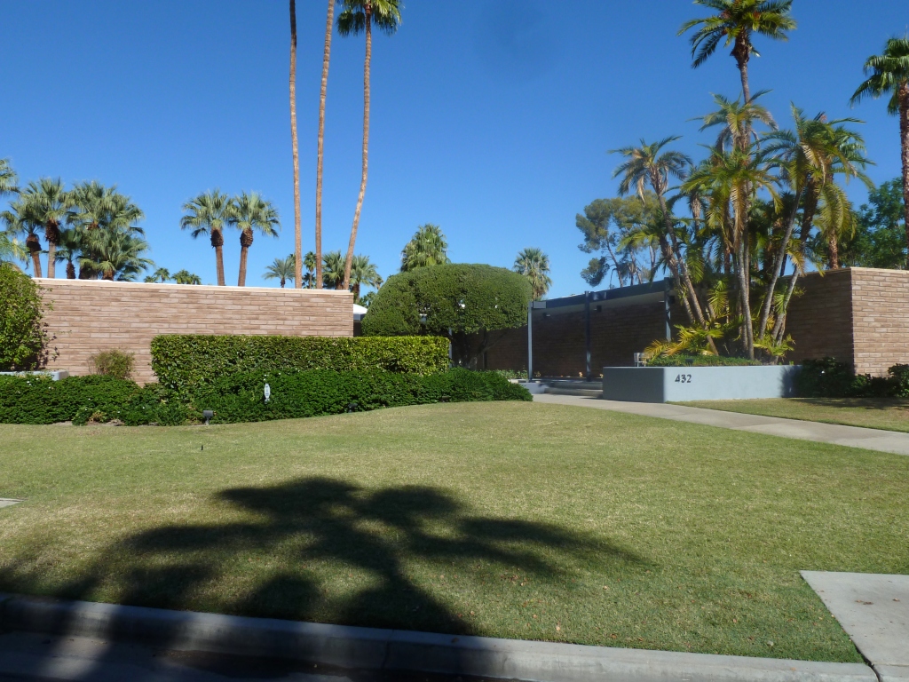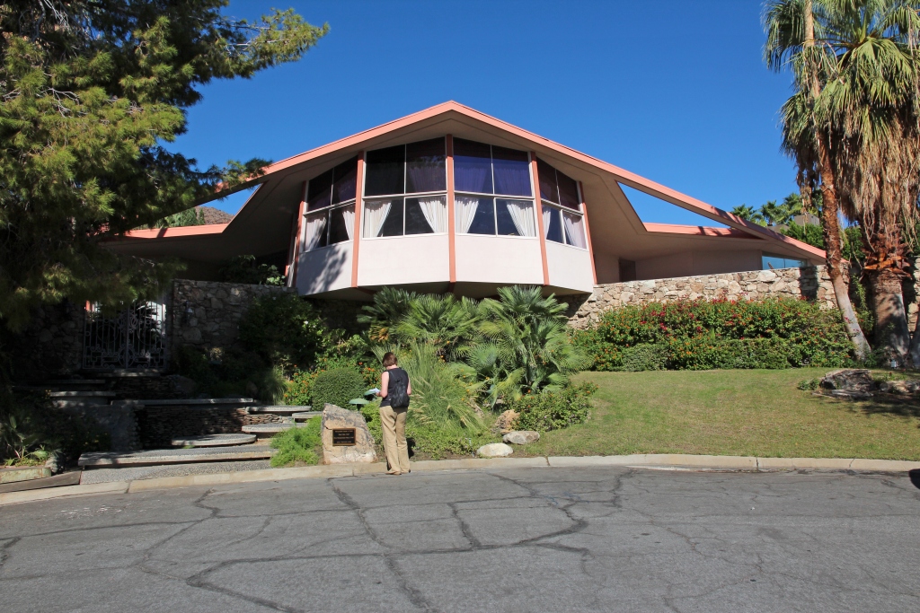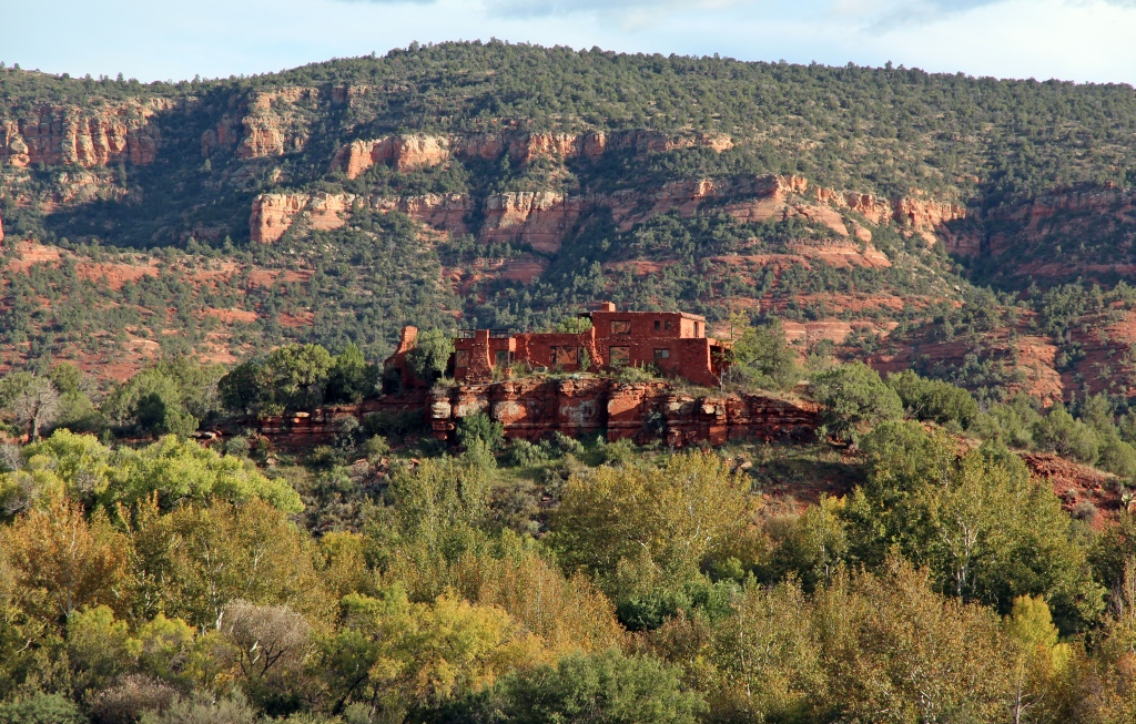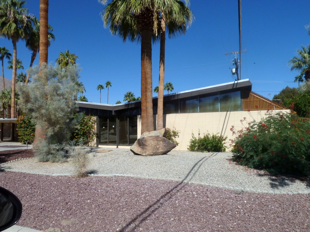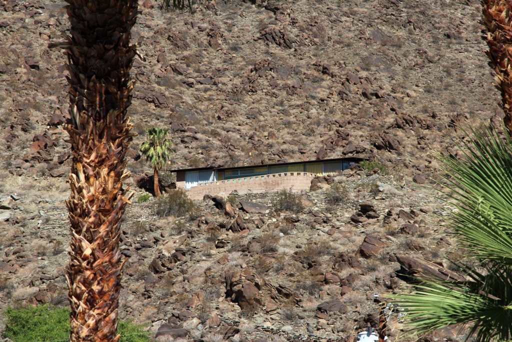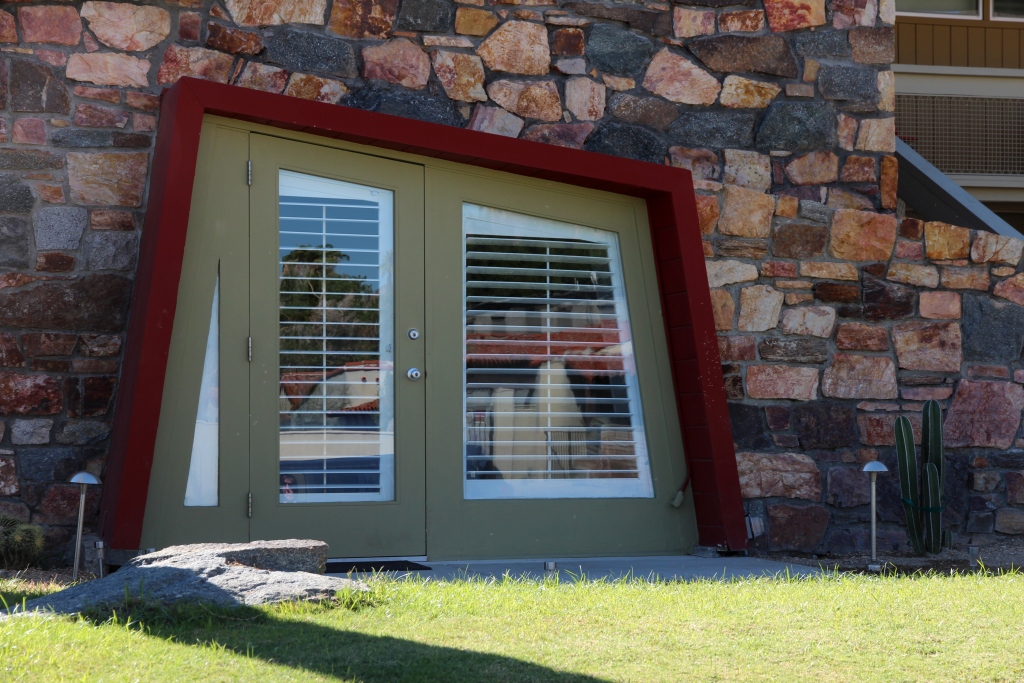 Viel Zeit haben wir ja nicht, aber es reicht für einen kurzen Rundgang, bei dem wir die Landschaft und Umgebung genießen. Besondere Aufmerksamkeit erweckt bei uns ein auf einem naheliegenden Felsen stehendes Haus. Wie wir später im Internet recherchieren, handelt es sich um das inzwischen zum Park gehörende House of Apache Fires. Es wurde anfangs der 1940er errichtet von Jack Frye - Pilot und Präsident von TWA - und seiner Frau Helen - die zuvor mit einem Vanderbildt verheiratet war. Nach der Scheidung blieb Helen Frye in dem seinerzeit noch nicht ganz fertiggestellten Haus, das später auf einigen Umwegen in den Besitz des Parks kam. Näheres zu dem Haus kann man hier nachlesen: