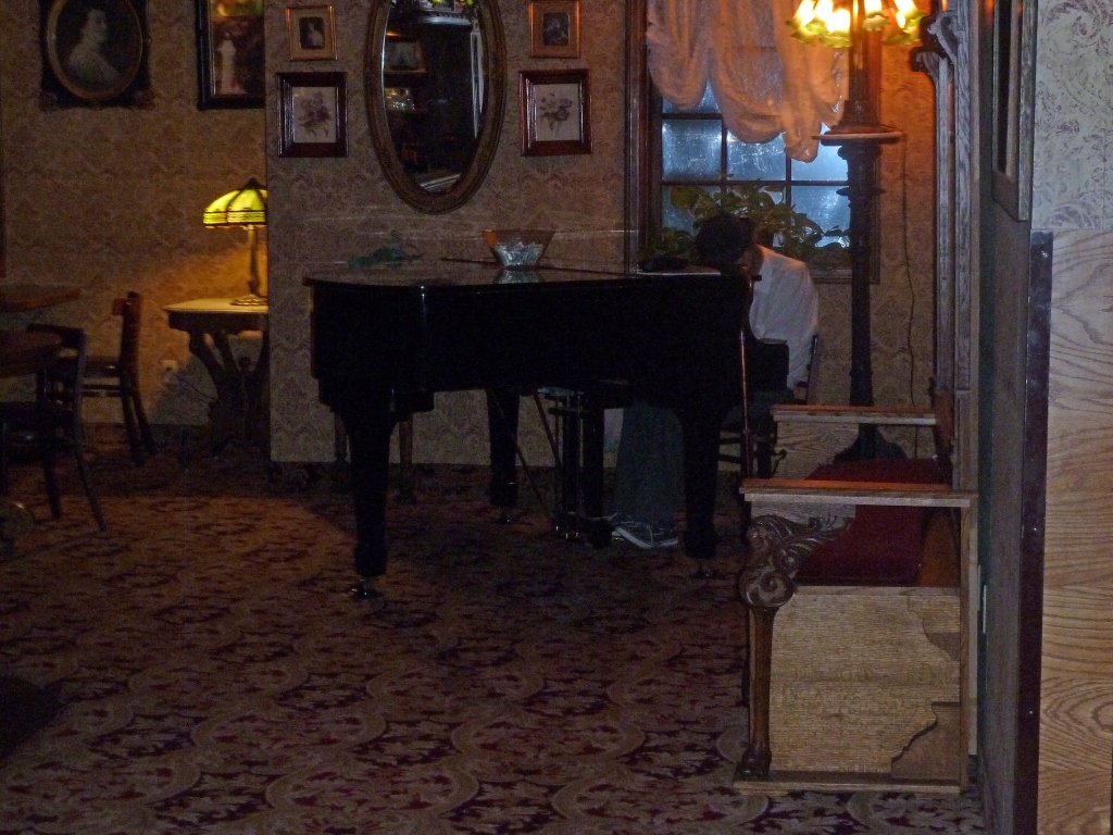 Zurück am Hotel gehen wir zunächst in das kleine Cafe/Geschäft am Parkplatz und trinken einen großen Kaffee. Da die Salate so klein waren, gönnen wir uns noch einen dicken Brownie dazu. Wir ergattern einen kleinen Tisch im Freien. Drinnen sorgt ein mehr oder weniger (eher weniger) talentierter Folksänger mit Gitarre für Livemusik. Er bekommt Beifall und auch einen Tip von uns.