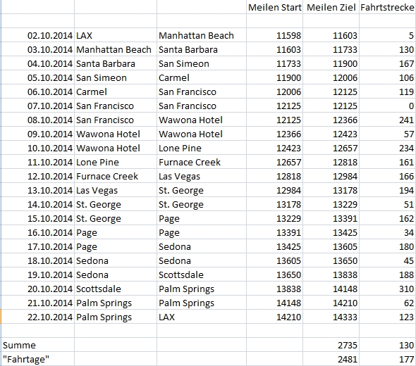 Fahrtstrecken: Die Strecken sind einschließlich aller Umwege und Einkaufsfahrten zum Supermarkt etc vom Kilometerzähler jeden Abend abgelesen. Das Maximum lag bei 310 mi und war eigentlich eine Art Transferfahrt und mangels größerer Sehenswürdigkeiten unterwegs auch bequem zu bewältigen. Der Durchschnitt von 130 mi ist natürlich durch die "Ruhetage" verfälscht. Aber auch an den Fahrtagen lag der Durchschnitt mit 177 Meilen für den Südwesten nicht sehr hoch. Zudem hat sich die Fahrerei vor allem durch die eingestreuten stationären Tage gut ertragen lassen. Das gilt vor allem auch für die beiden Tage mit +/- 240 mi nach und ab Yosemite.