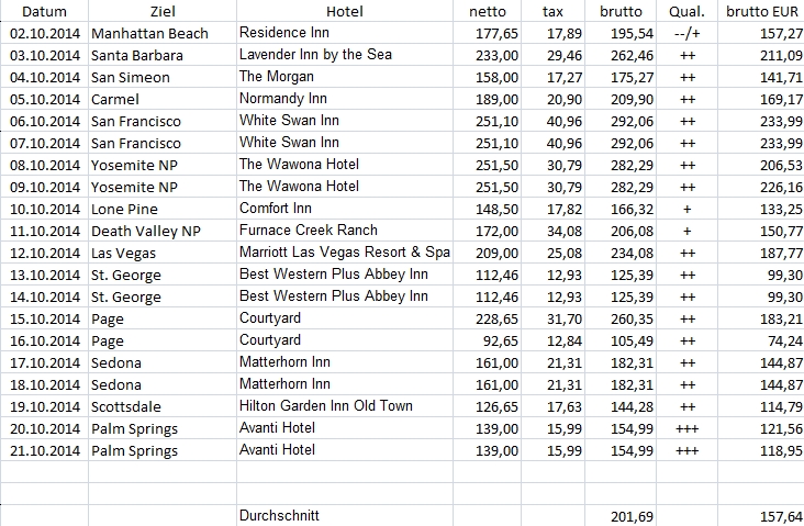 Da wir nicht nur abends ins Bett fallen und in aller Frühe wieder weiterziehen, sind wir bereit, für das Hotelambiente auch entsprechend zu zahlen. Bis auf das Comfort Inn in Lone Pine (zu teuer und abgelegen) können wir auch jedes der Quartiere uneingeschränkt weiterempfehlen.