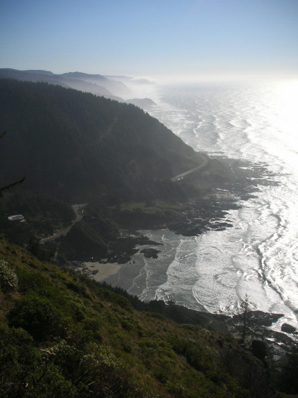 Hinter Newport erwartet uns Nebel, Nebel und nochmals Nebel. Die Entscheidung, das Hotel in Yachats zu stornieren war daher goldrichtig, wir wären schon sehr früh hier gewesen und das Wetter ist alles andere als einladend. Ich lotse Patrick auf den Aussichtspunkt auf Cape Perpetua, aber die Aussicht ist bis auf einen winzigen Punkt in Nebel gehüllt. Sehr schade.