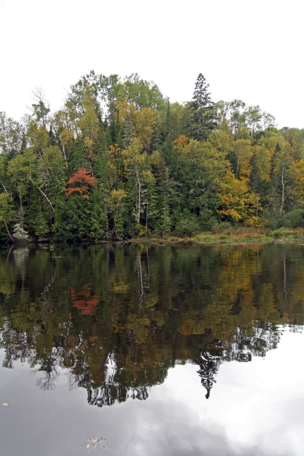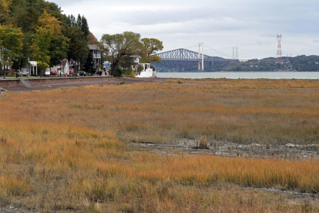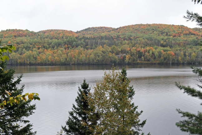 Bis wir endlich aufbrechen, ist es schon nach 8:00. Wir fahren zunächst in die falsche Richtung, weil die Baustellenabsperrung bei der Auffahrt wie eine Blockade wirkt. Bei der nächsten Gelegenheit kehren wir um und fahren durch eine nicht allzu ansprechende Landschaft – nur zwischendrin etwas bunter Wald – in Richtung St.-Lorenz-Strom. Zwischendrin wird noch getankt.